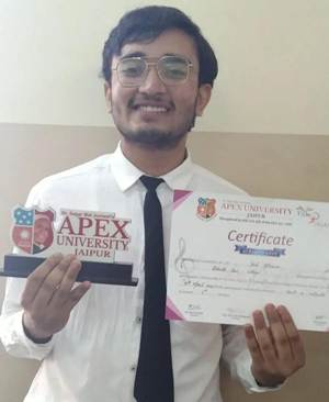 Yash Sharma, Semester I, Secured the Second Position in a Just-a-Minute Competition, 'Technoaagaz' 2022 organized by Apex University, March,2022.