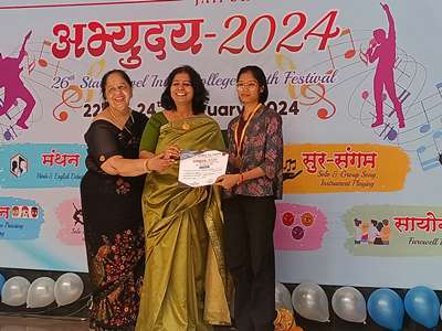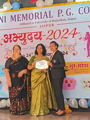 Proud Moment Divya Pathak of 3rd Semester was awarded as the Best Paper Presenter with a certificate of merit and a cash prize of Rs 3000 in a National Conference organized on 19th march 2024 by TERI, NEERI, Rajasthan pollution control board, central pollution control board and Ministry of environment forest and climate change in collaboration with S.S. Jain Subodh P.G. (Autonomous) college, Jaipur, Rajasthan.