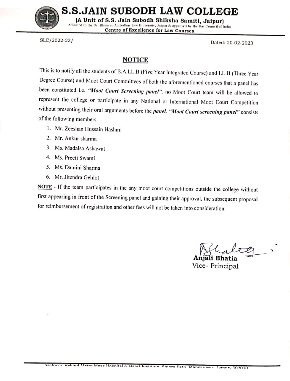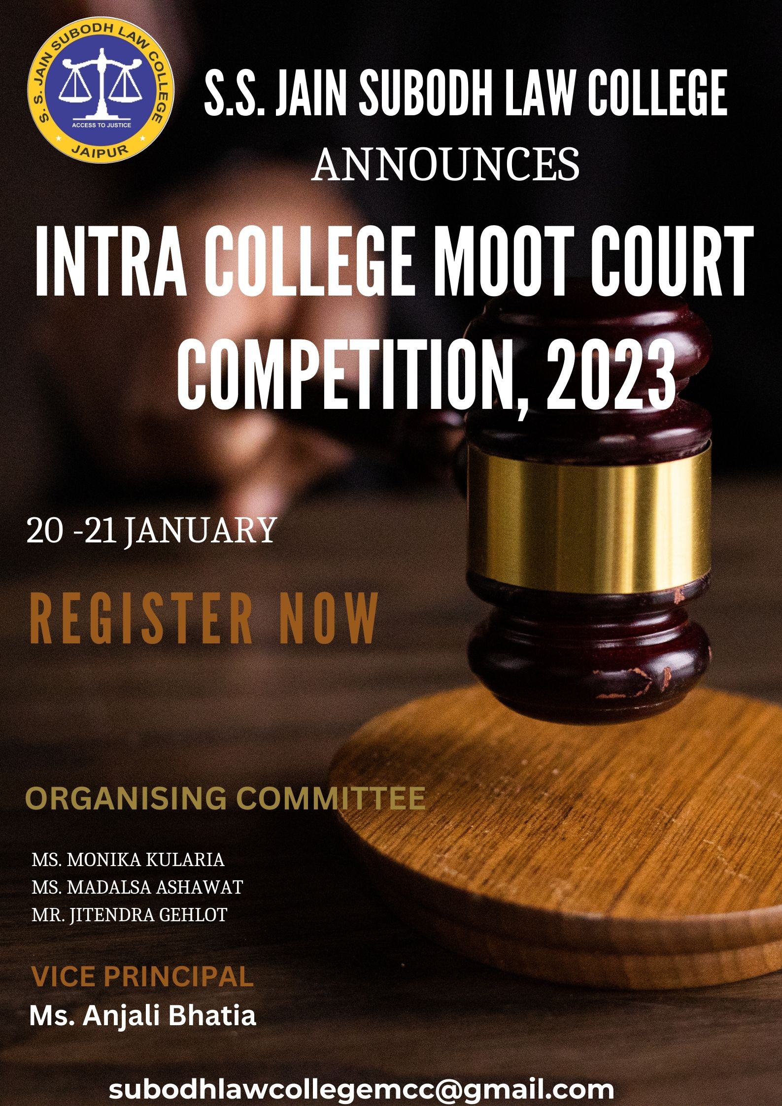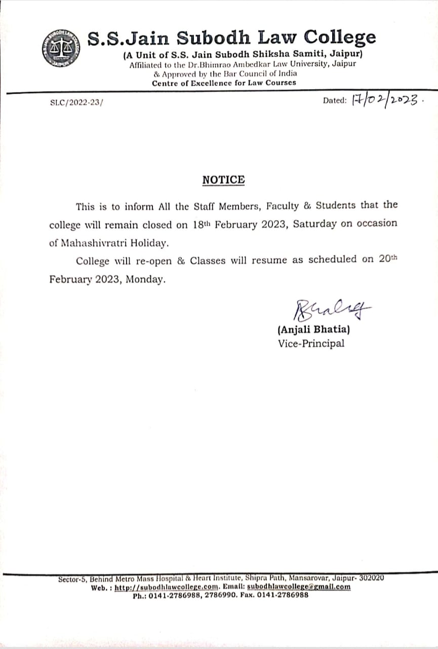 SLC Intra College Moot Court Competition, 2023 S.S. Jain Subodh Law College proudly announces its Intra College Moot Court Competition. 2023. The competition is to be organized on 20 and 21 January, 2023.