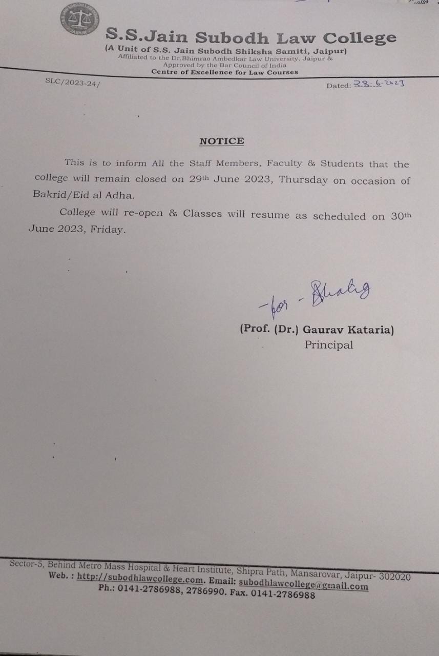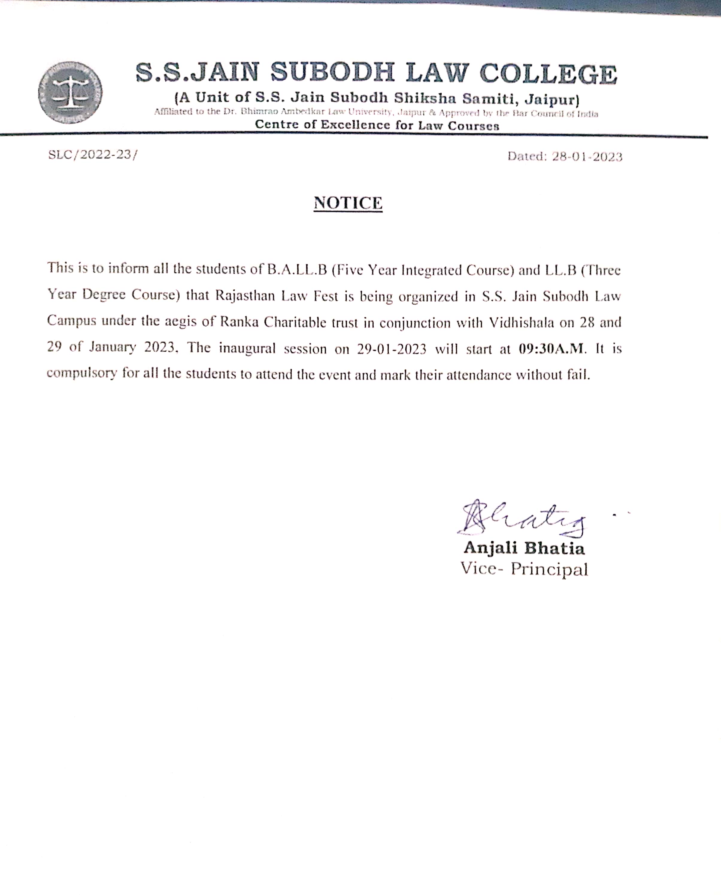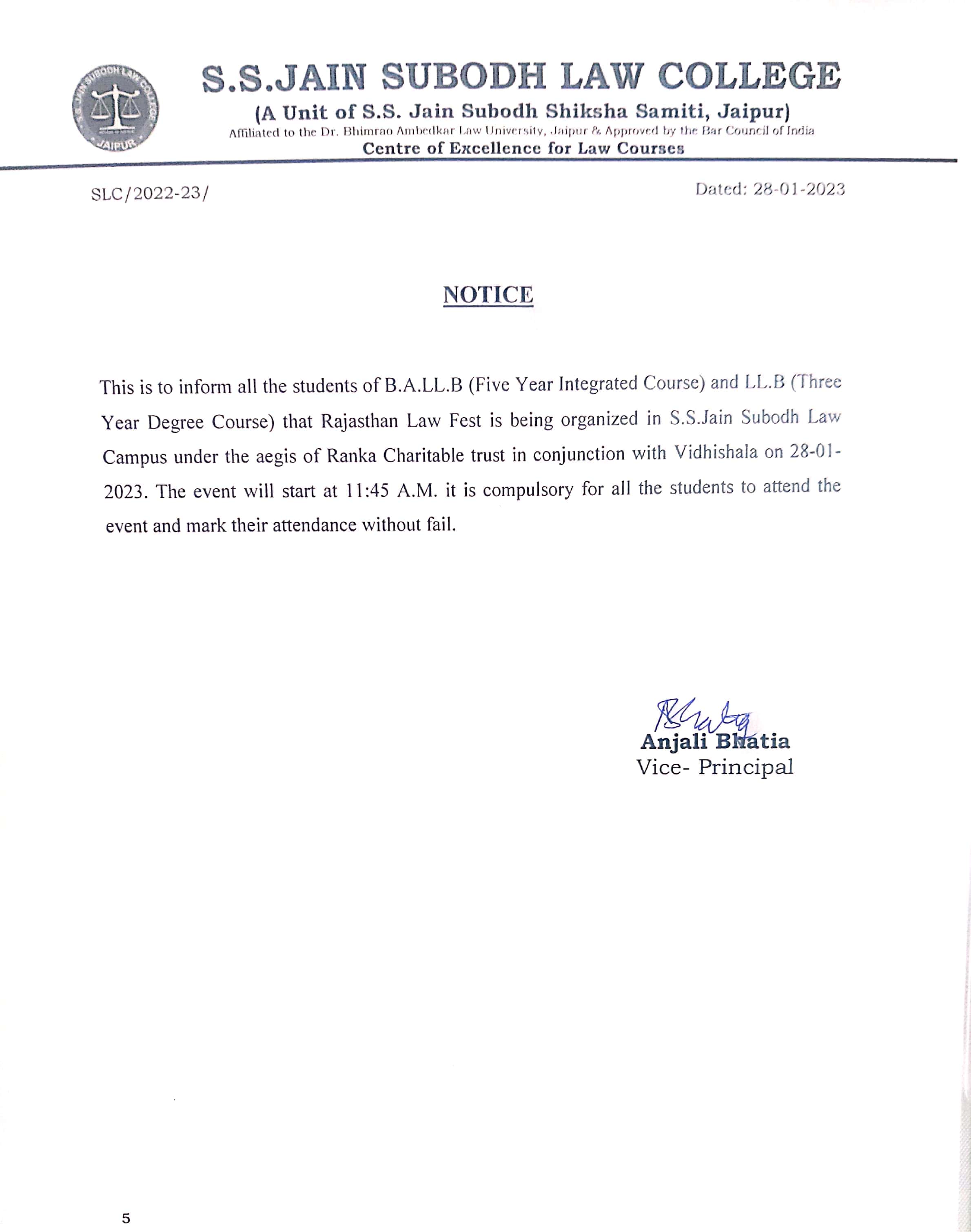 Rajasthan Law Fest is being organized in S.S. Jain Subodh Law Campus under the aegis of Ranka Charitable trust in conjunction with Vidhishala on 28th and 29th January 2023. This is inform all the students of B.A.LL.B and LL.B that Rajasthan Law Fest is being organized in S.S. Jain Subodh Law Campus under the aegis of Ranka Charitable trust in conjunction with Vidhisala on 28-01-2023 . It is Compulsory for all the students to attend the event and mark their attendance without fail.