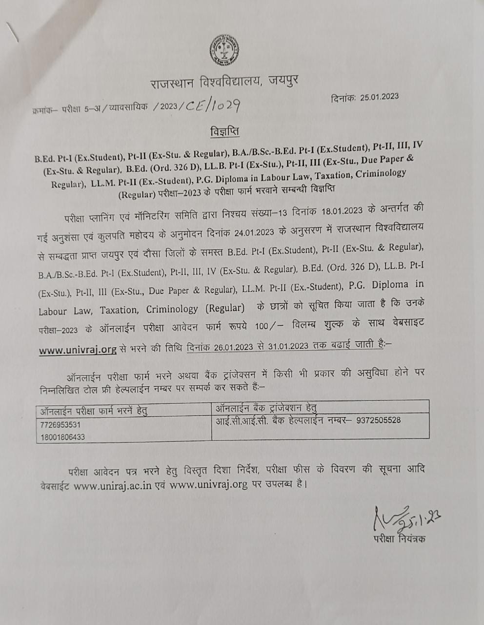 LLB (Rajasthan University) forms filling last date extended till 31-01-2023 LLB (Rajasthan University) forms filling last date extended till 31-01-2023