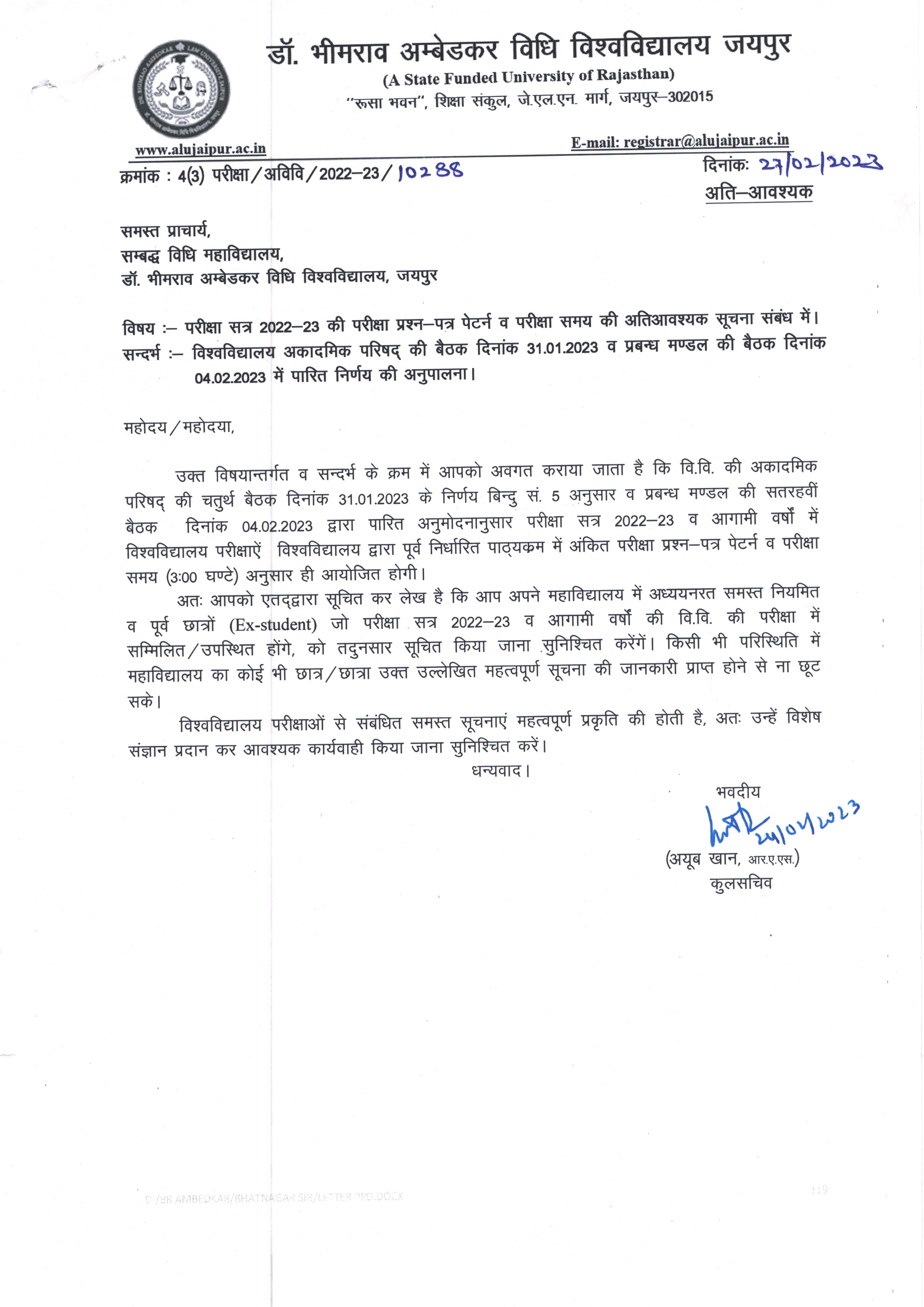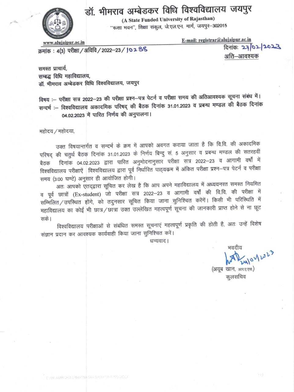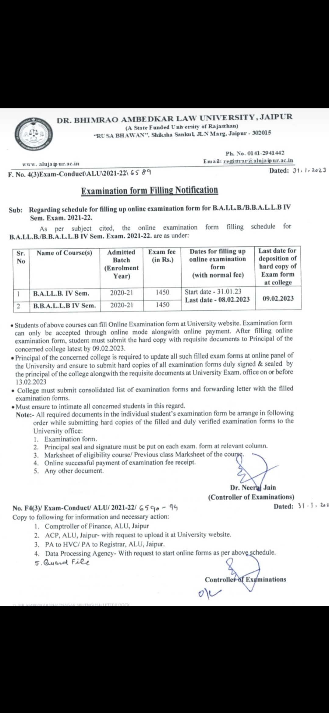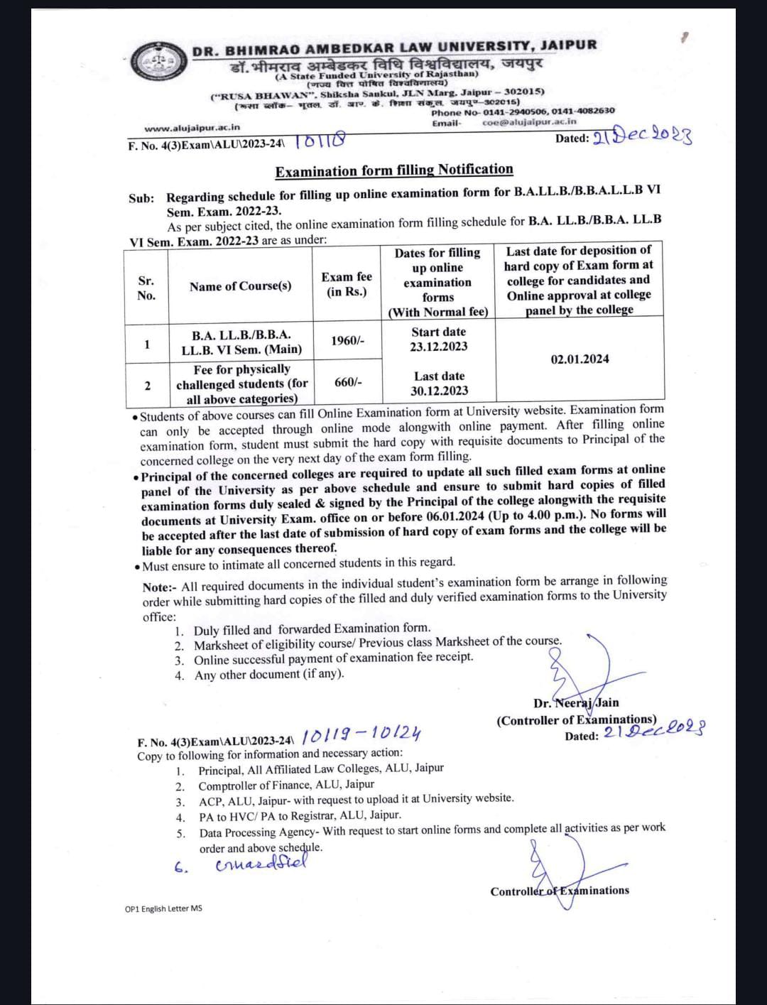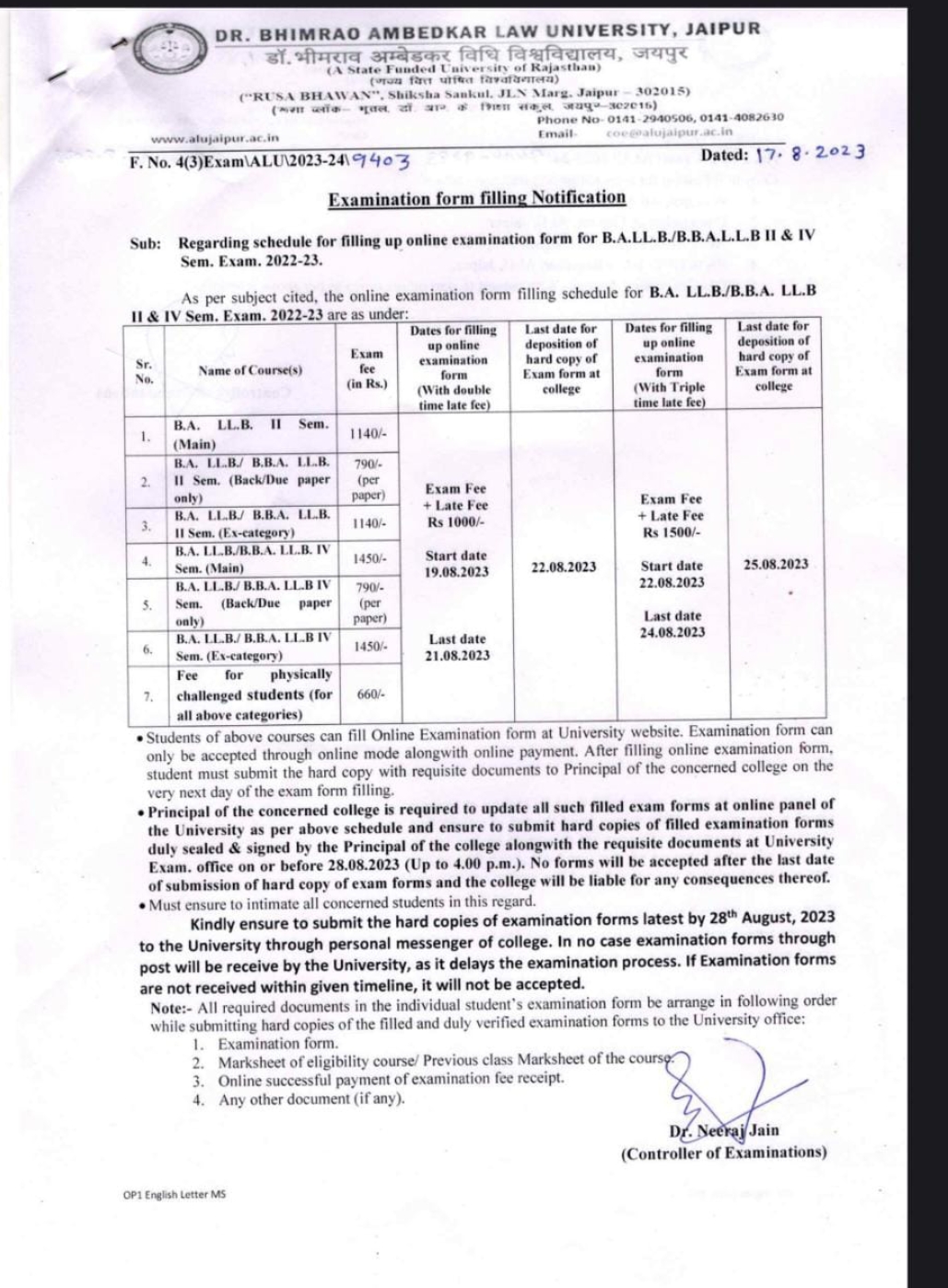 LLB. (3 years) and LLM Examination Form Filling Notice 2023. ALU, Jaipur LLB. (3 years) and LLM Examination Form Filling Notice 2023, ALU, Jaipur