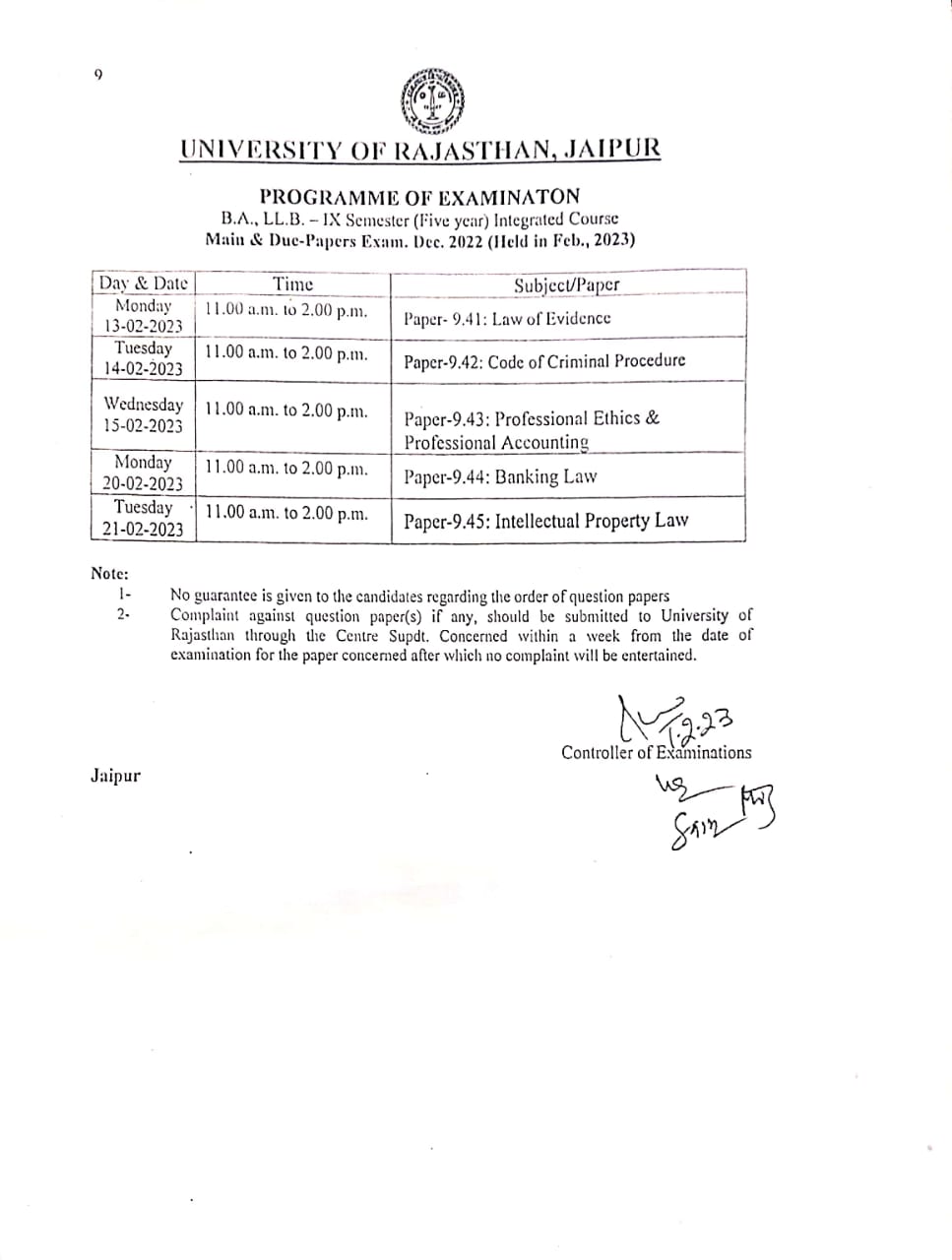 B.A.LL.B. IX Semester Main and Due Papers Exam Notice B.A.LLB. IX Semester (Five year integrated ) university of rajasthan main and due papers exam notice |