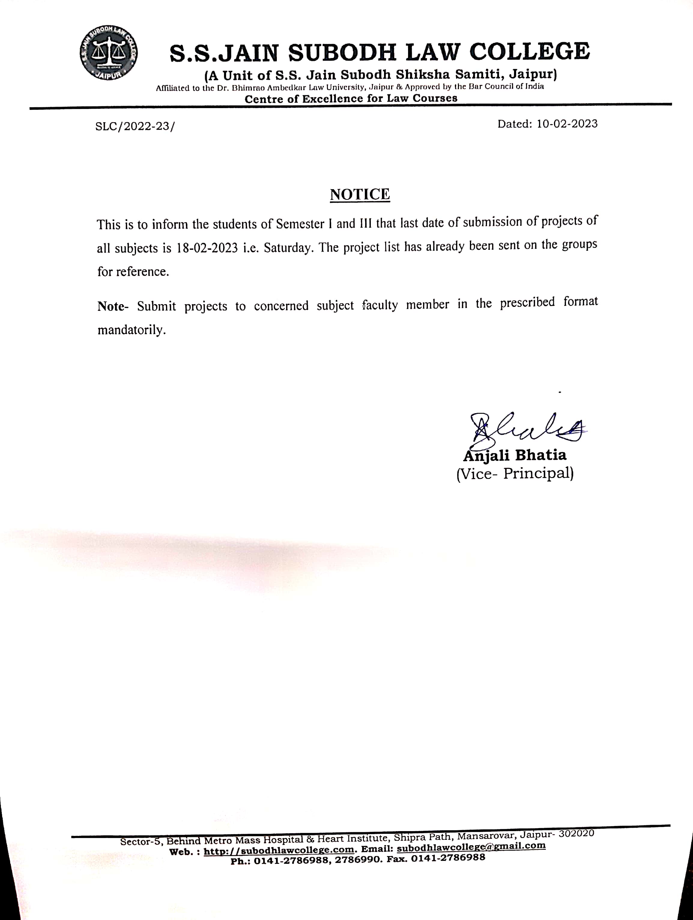 B.A.LLB. Ist & IIIrd Semester last due date submission of project notice B.A.LLB. Ist & IIIrd Semester last due date submission of project notice of all subject is 18-02-2023 i.e. Saturday