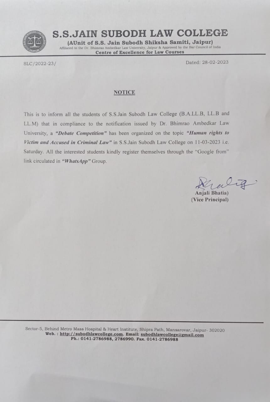 Students of B.A.LLB. , LLB., and LLM. "Debate Competition " Notice Students of B.A.LLB. , LLB., and LLM. are Inform that "Debate Competition has been Organized on the topic "Human Rights to Victim and Accused in Criminal Law" in S.S. Jain Subodh Law College On 11-03-2022 Saturday. |