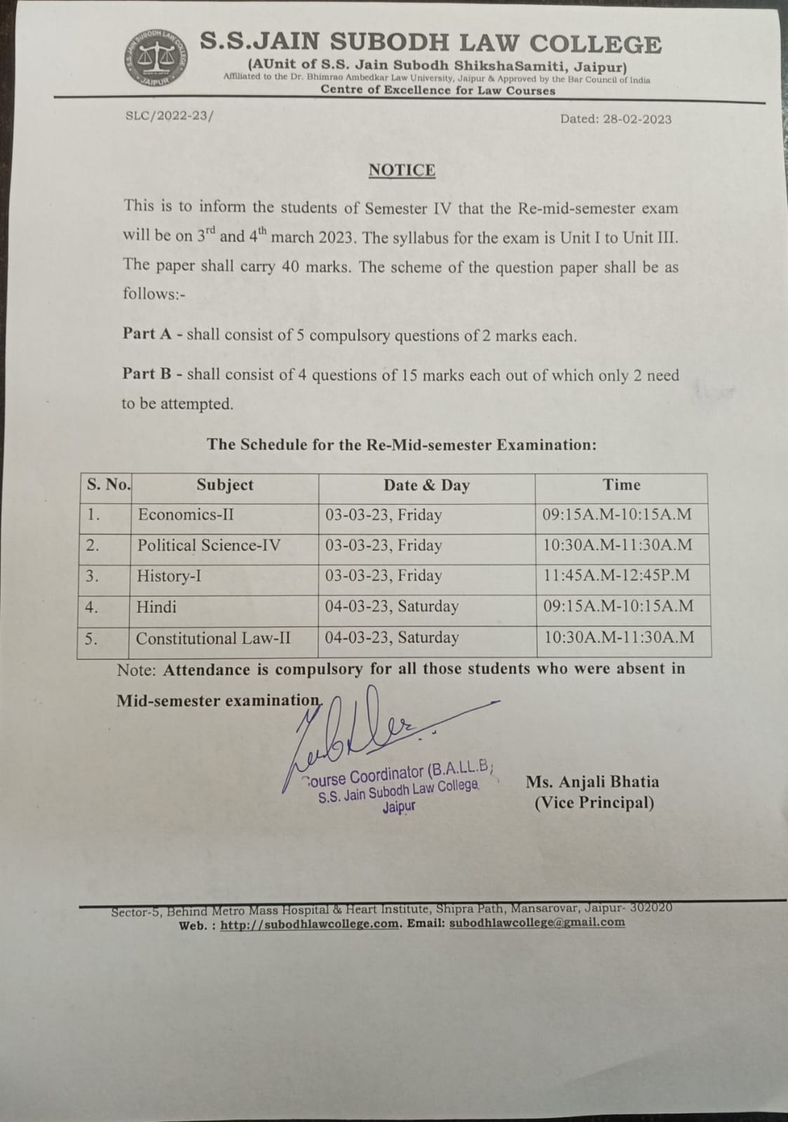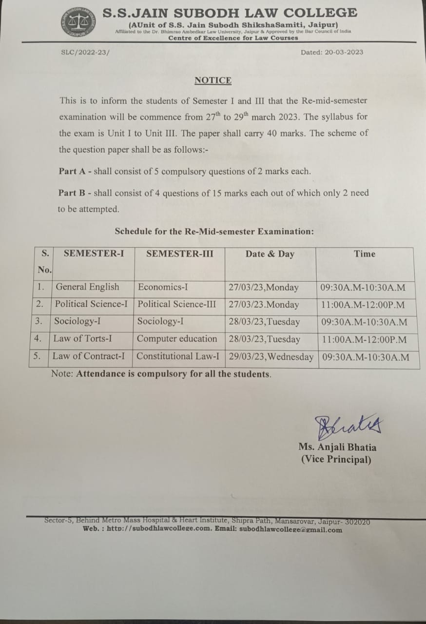 B.A. LLB. IV Semester Re-Mid Semester Exam Date Sheet Notice B.A. LLB. IV Semester Re-Mid Semester Exam will be on 3rd and 4th March 2023 |
