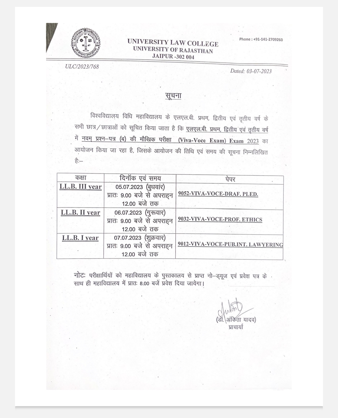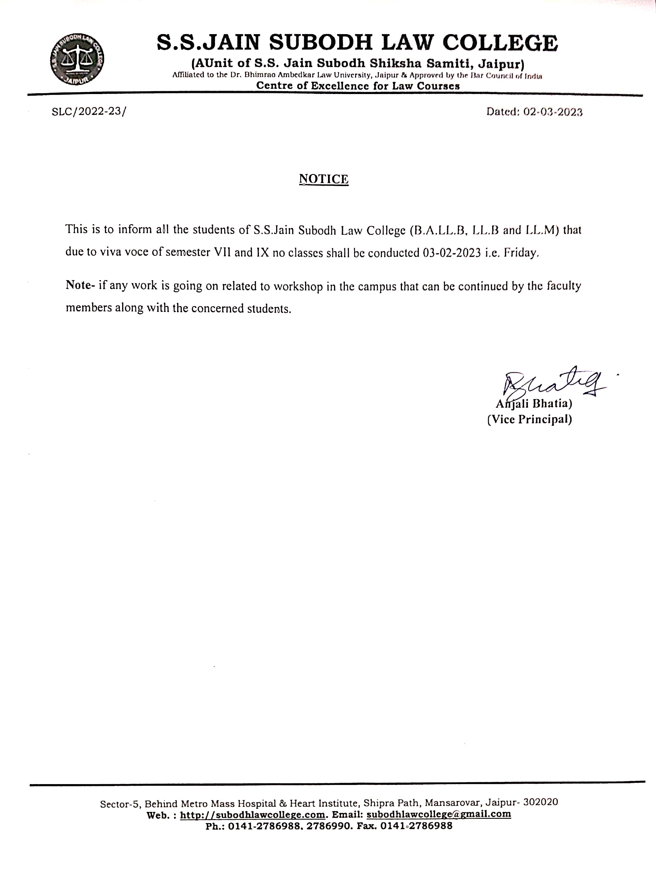 No Class of B.A.LLB. on 03-03-2023 Due to Viva Voce of VII and XI Semester This is Inform that No Class of B.A.LLB. on 03-03-2023 Due to Viva Voce of VII and XI Semester |