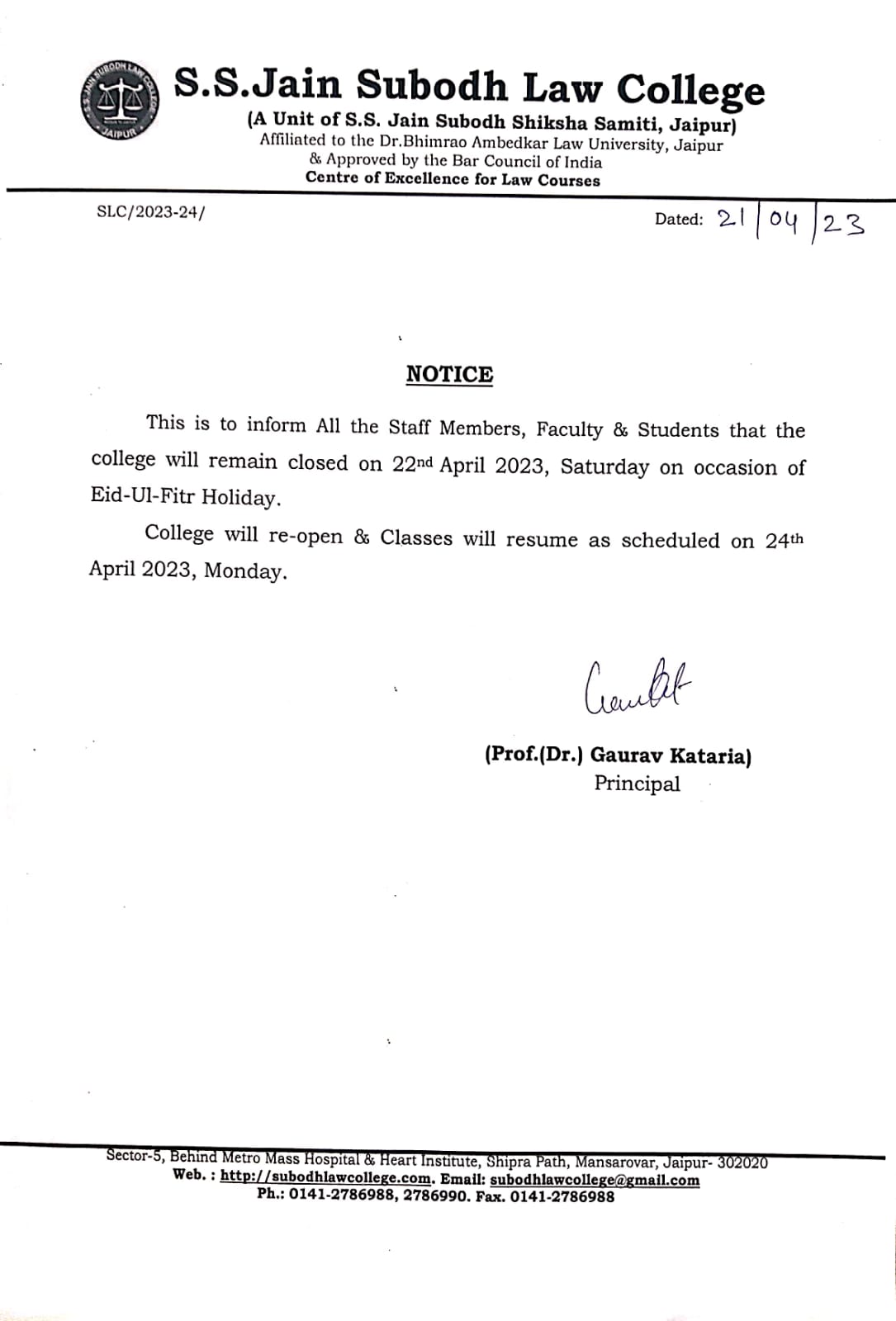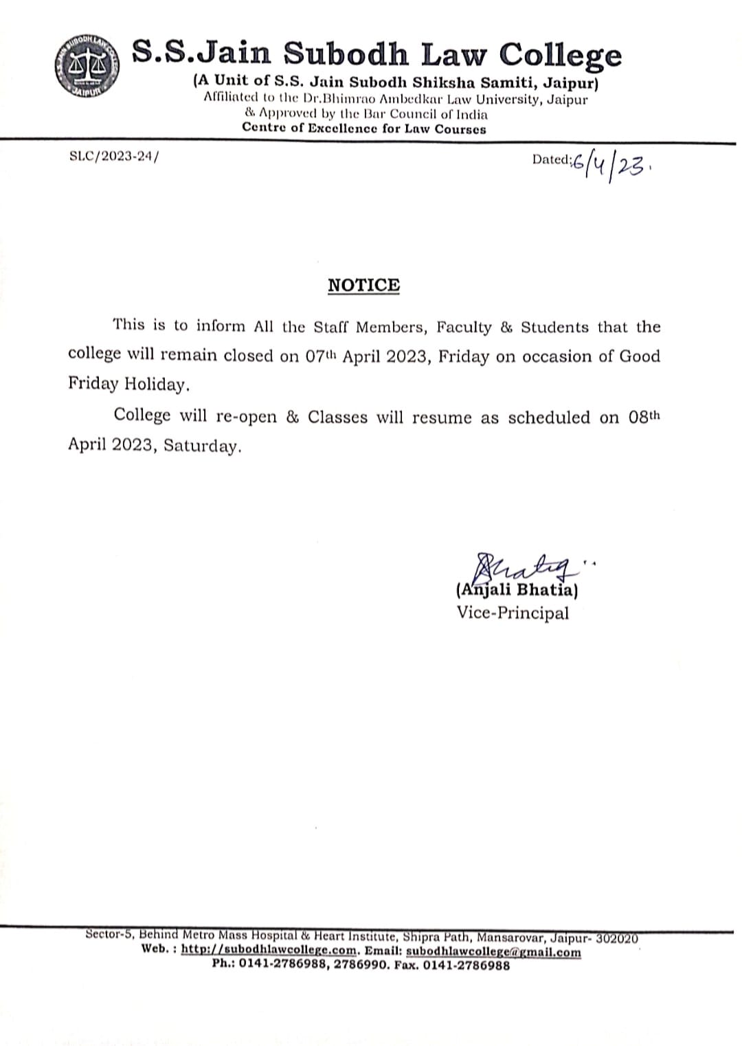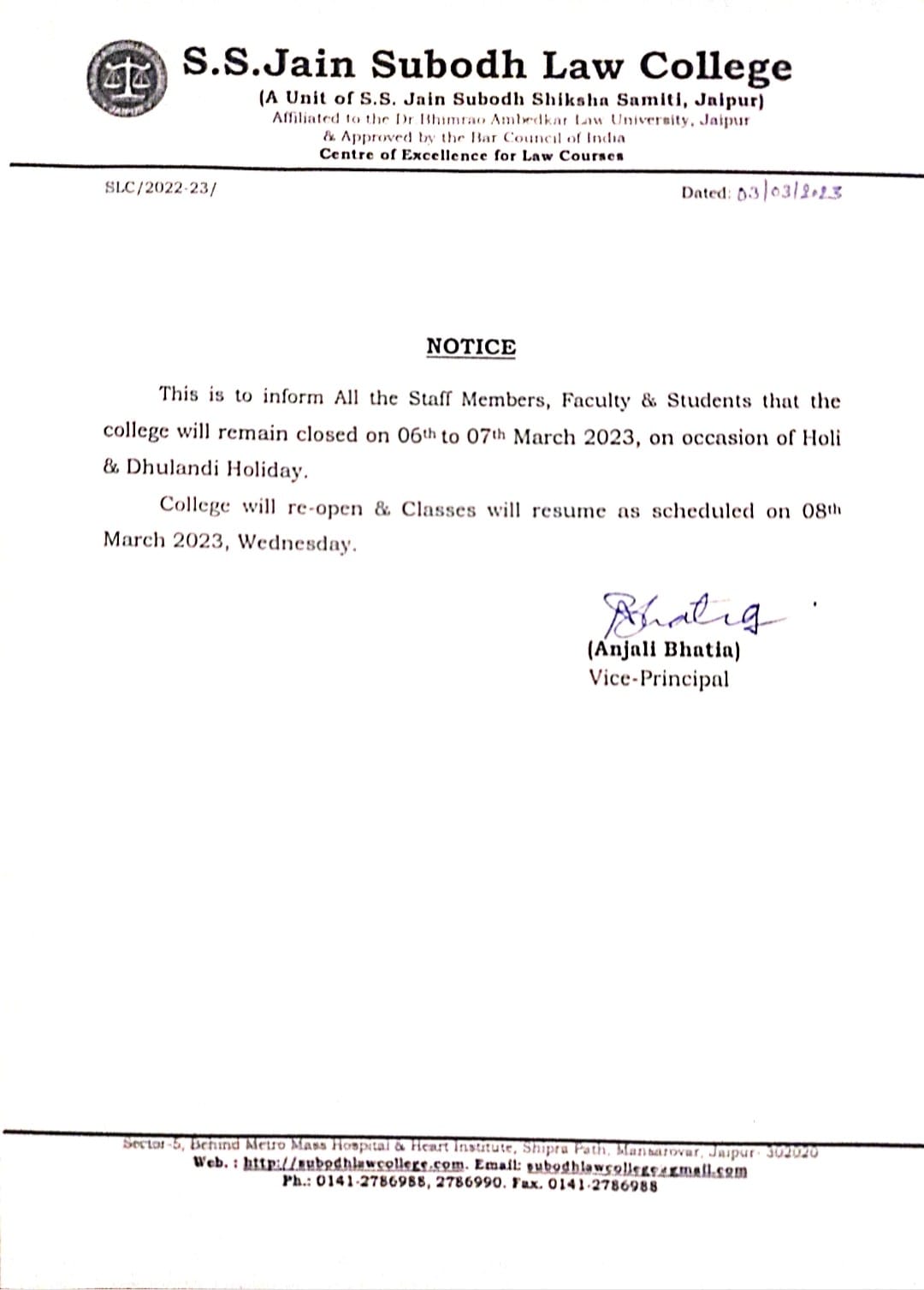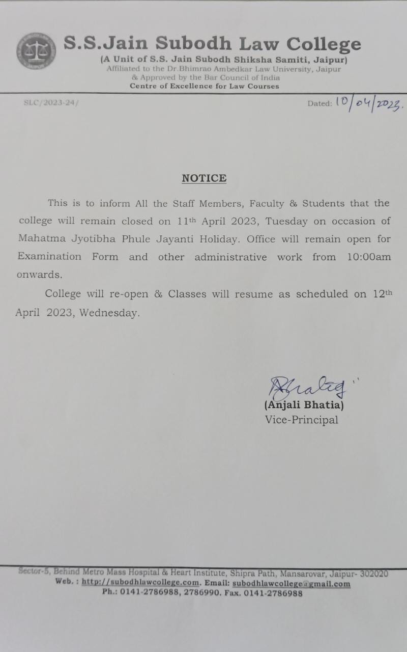 students that the college will remain closed on 11 April 2023, Tuesday on Occasion of Mahatma Jyotibha Phule Jayanti Holiday. College will re-open and classes will resume as scheduled on 12th April 2023. Office will remain open for Examination form and other Administrative work from 10:00 am onwards |