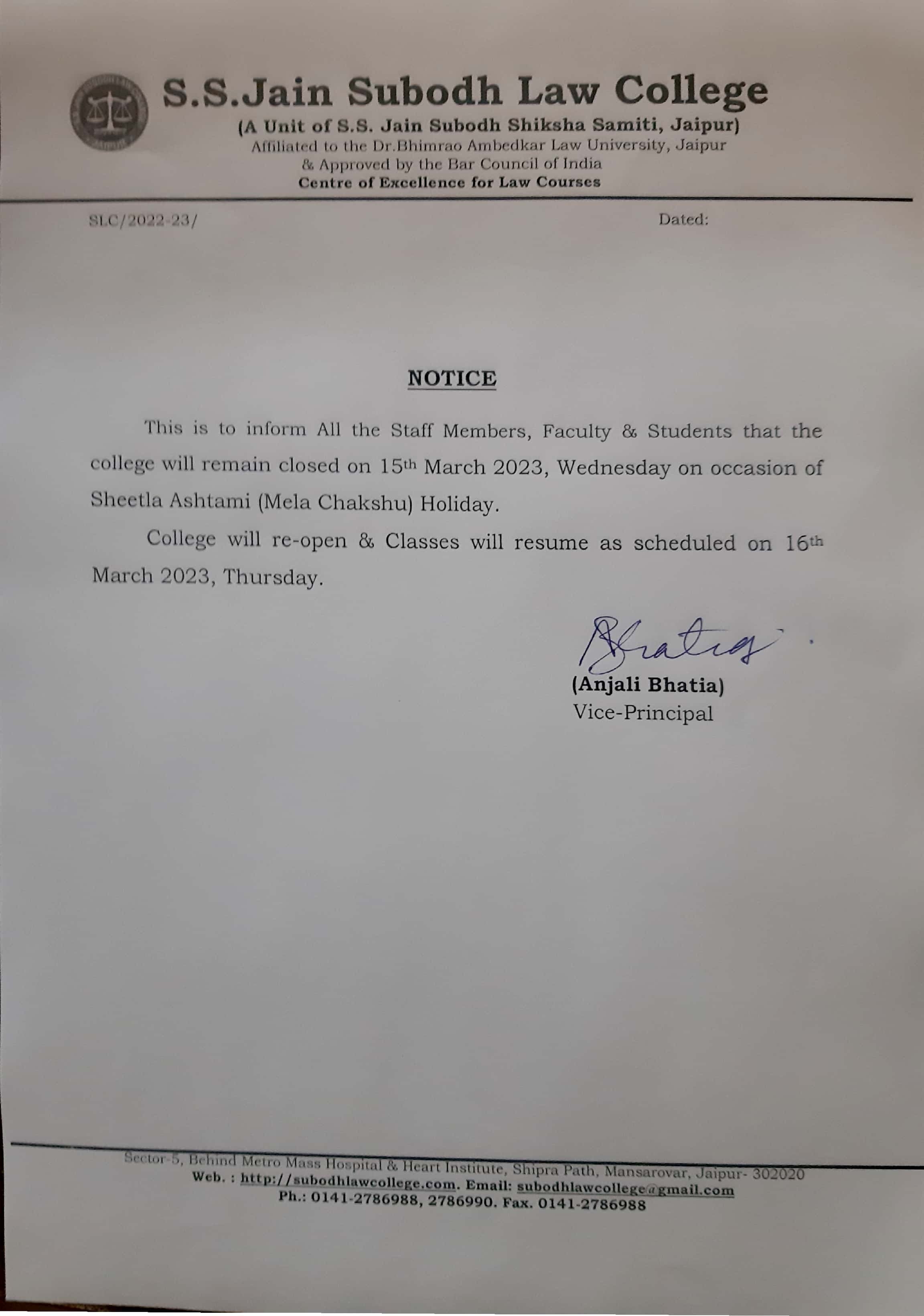 College will be remain closed on 15th march 2023, Wednesday on occasion of sheetla asthami holiday This is inform to all staff members, faculty and students , that the College will be remain closed on 15th march 2023, Wednesday on occasion of sheetla asthami holiday.