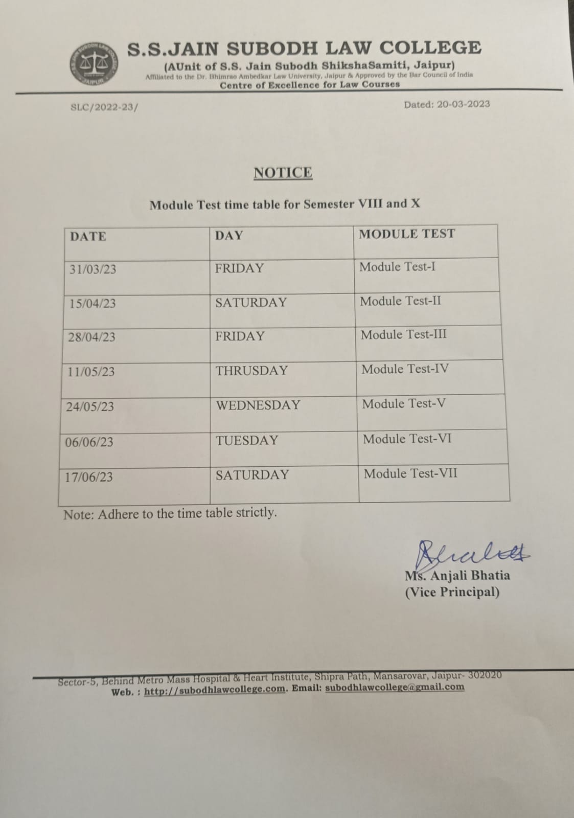 B.A.LLB. VIII and X Semester Module Exam Time Table Notice B.A.LLB. VIII and X Semester Module Exam Time Table Notice