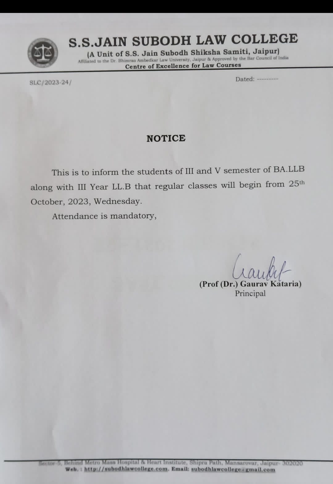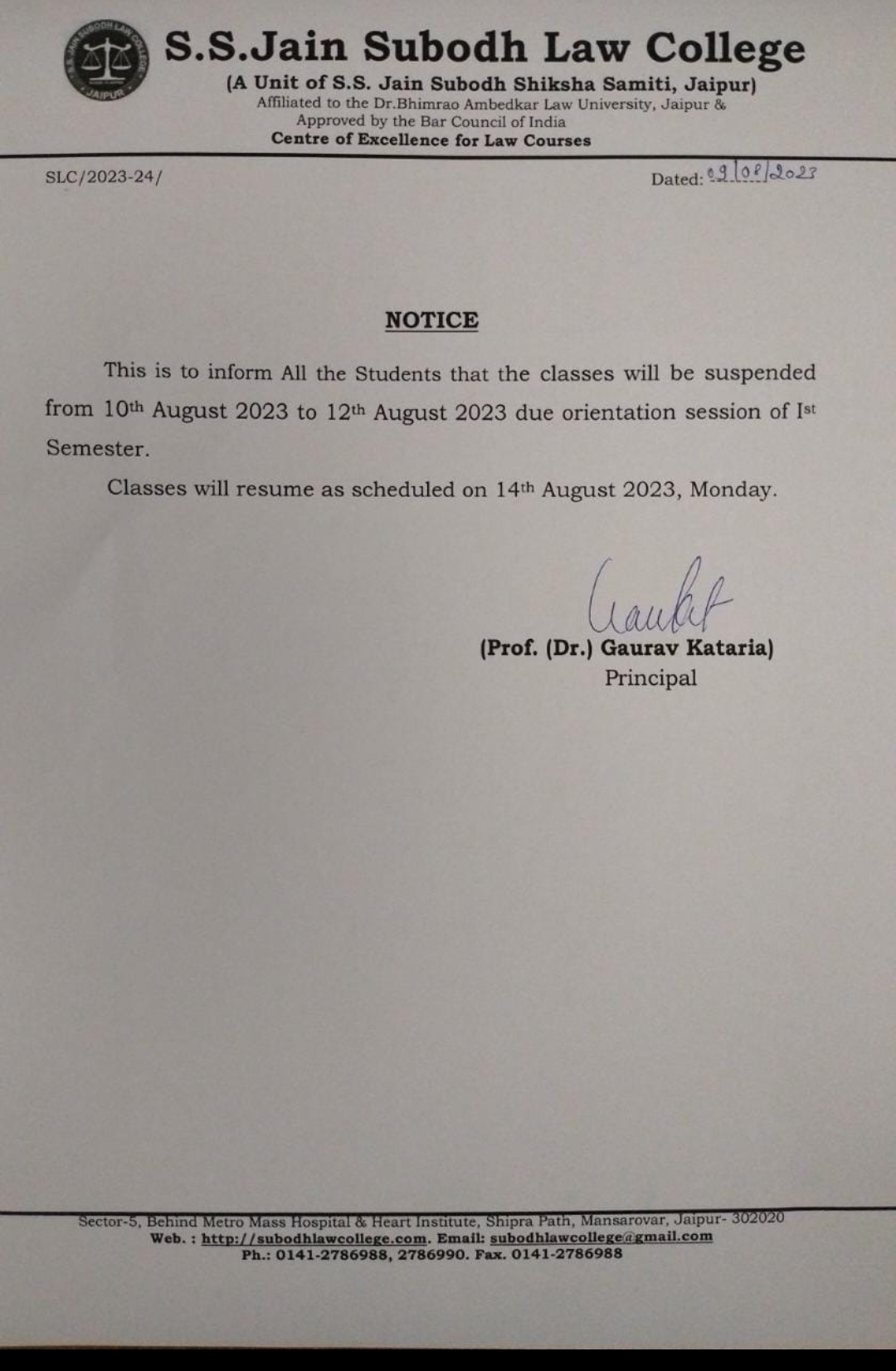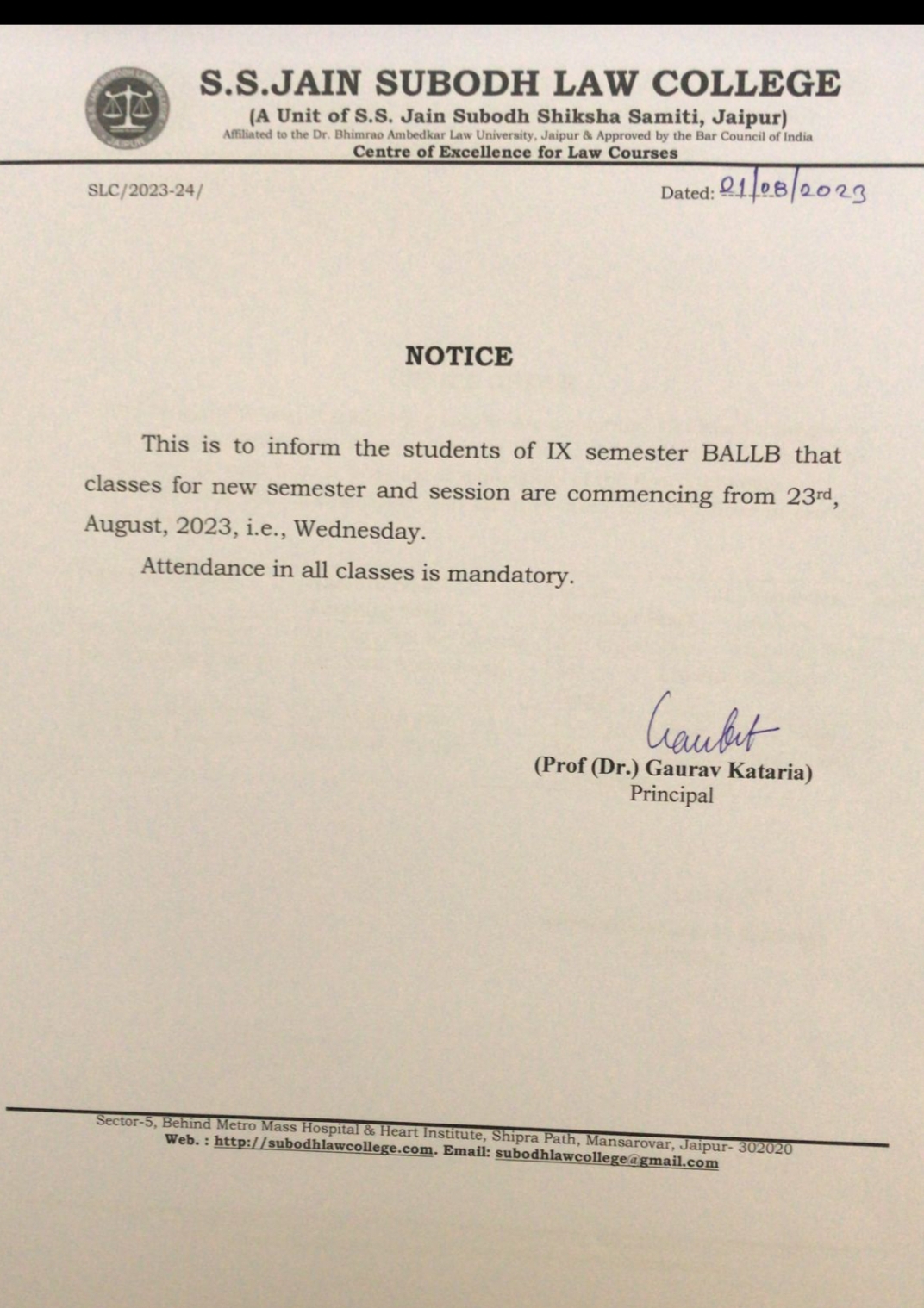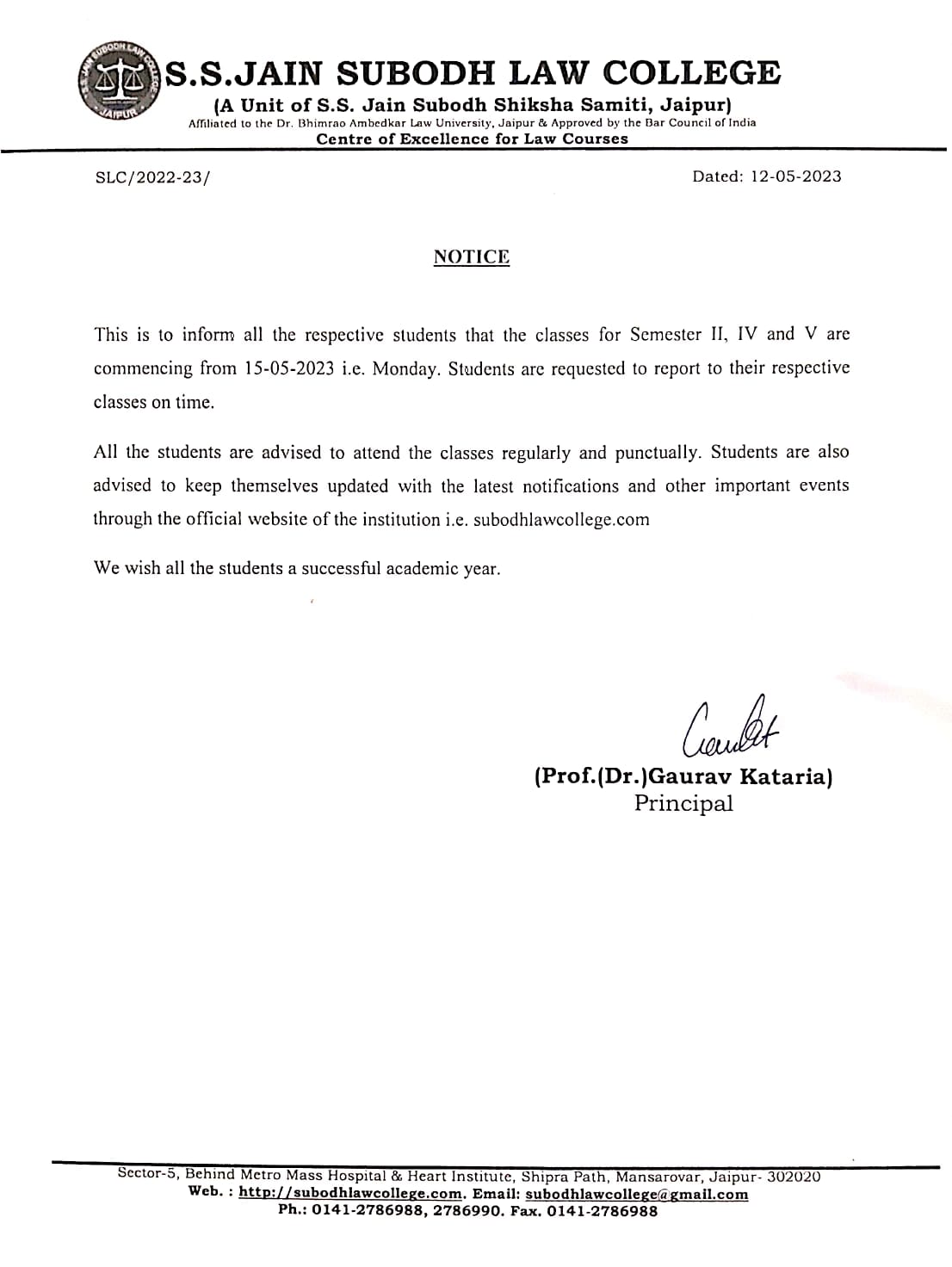 students of S.S.Jain Subodh Law College semester VIII and X that the regular