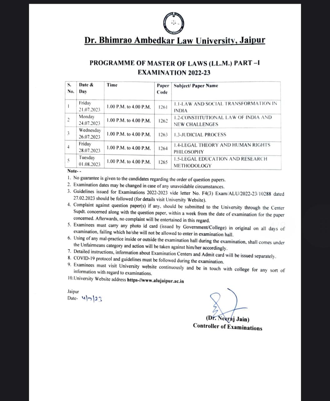 LL.M First Year Examination 2023-24 Time Table LL.M First Year Examination 2023-24 Time Table
