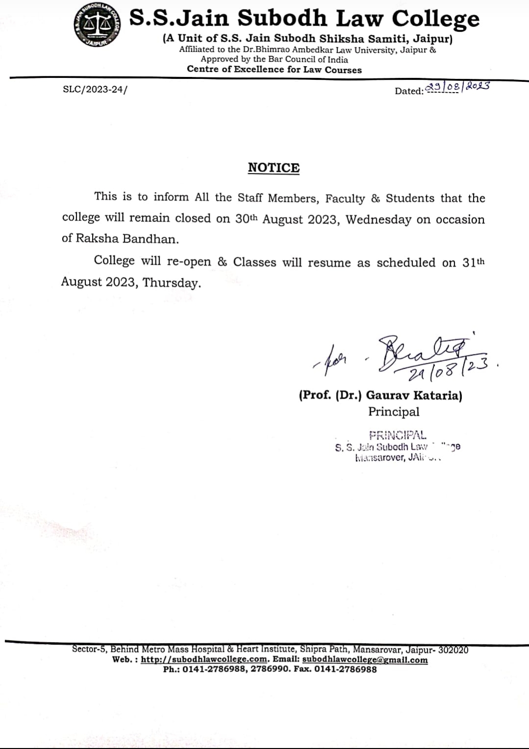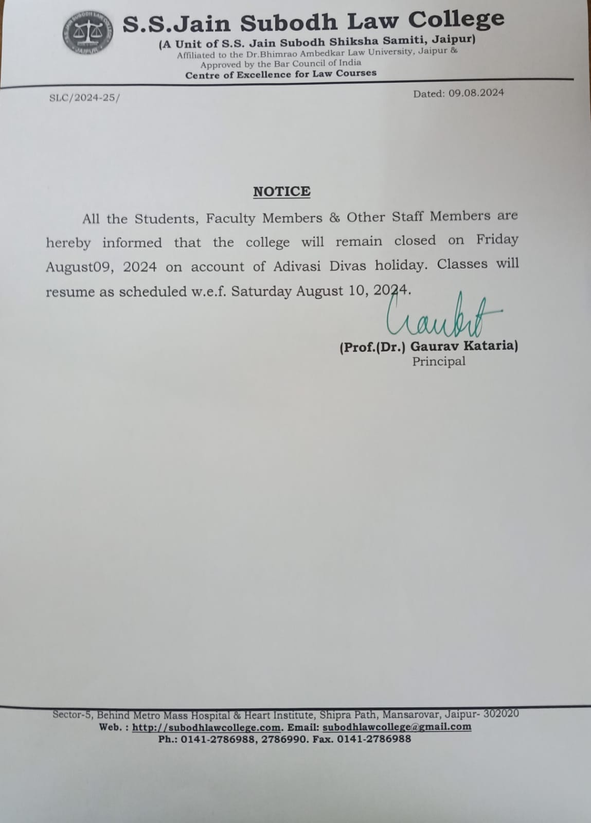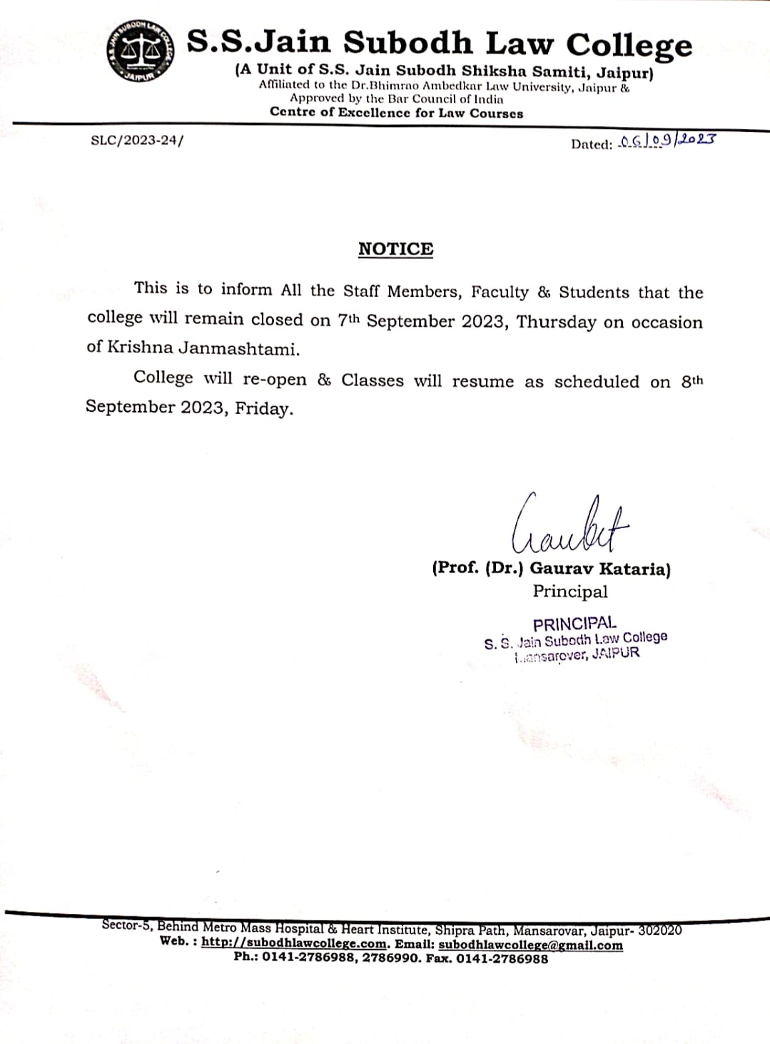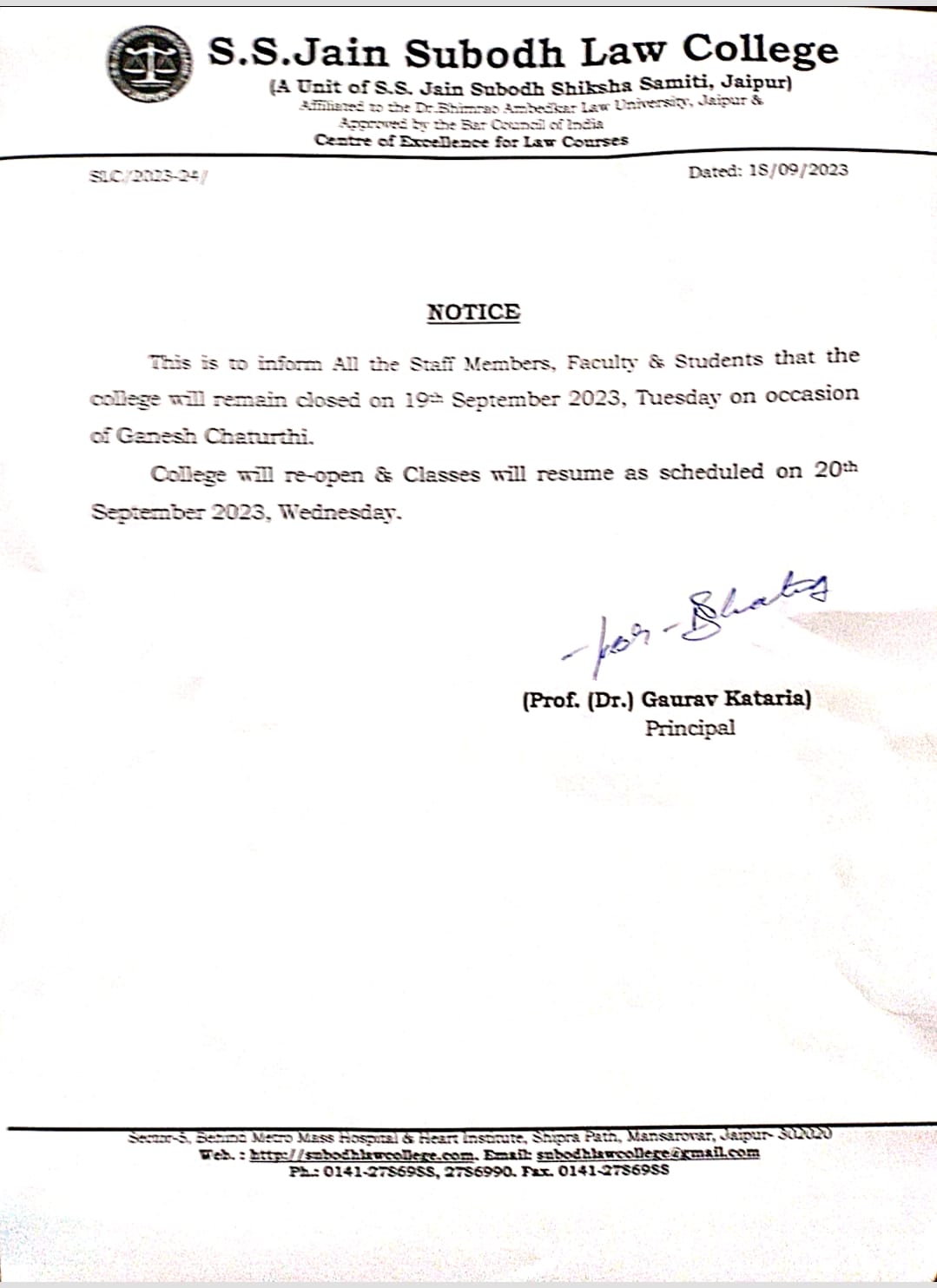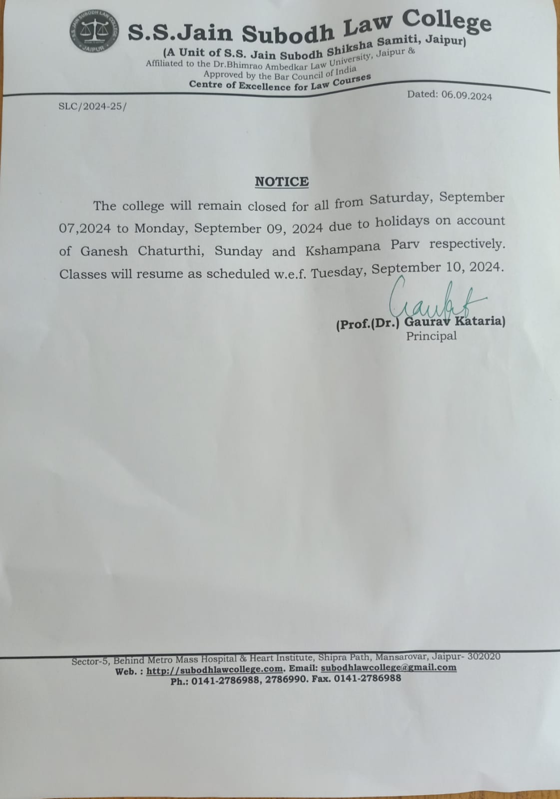 College will remain closed for all from Saturday, September 07,2024 to Monday, September 09 2024 due to holidays on account of Ganesh Chaturthi, Sunday and Kshampana Parv respectively. The College will remain closed for all from Saturday, September 07,2024
