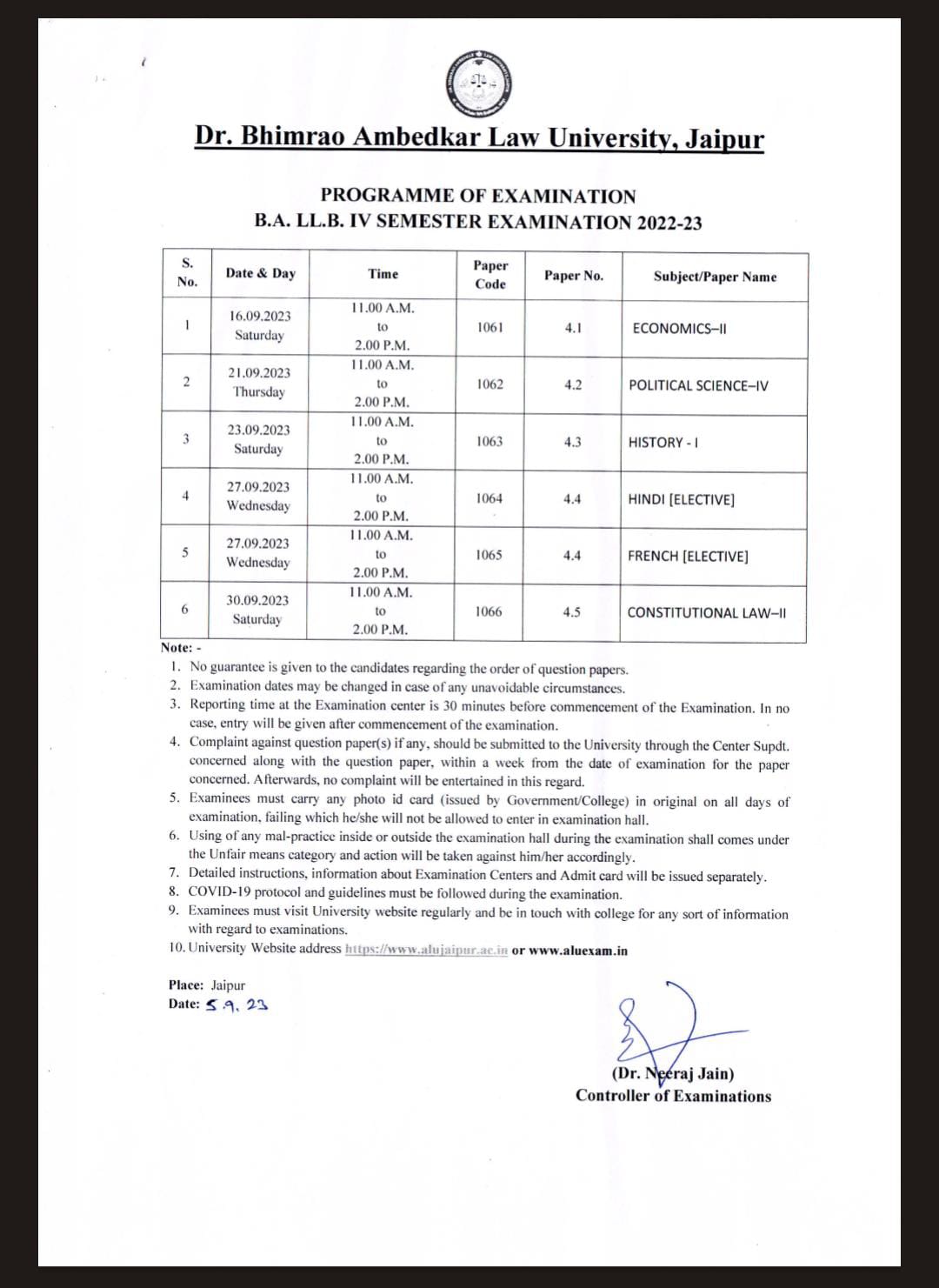 B.A.LLB. IV Semester Time Table 2023, ALU Jaipur B.A.LLB. IV Semester Time Table 2023, ALU Jaipur