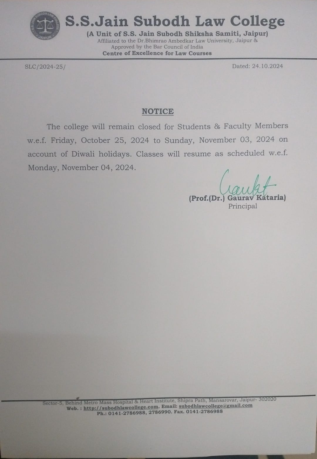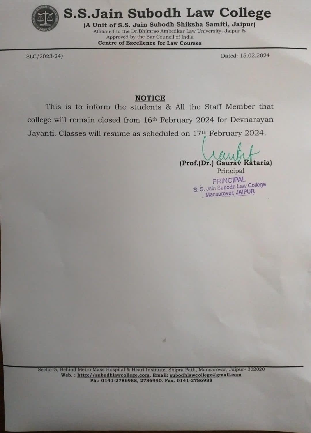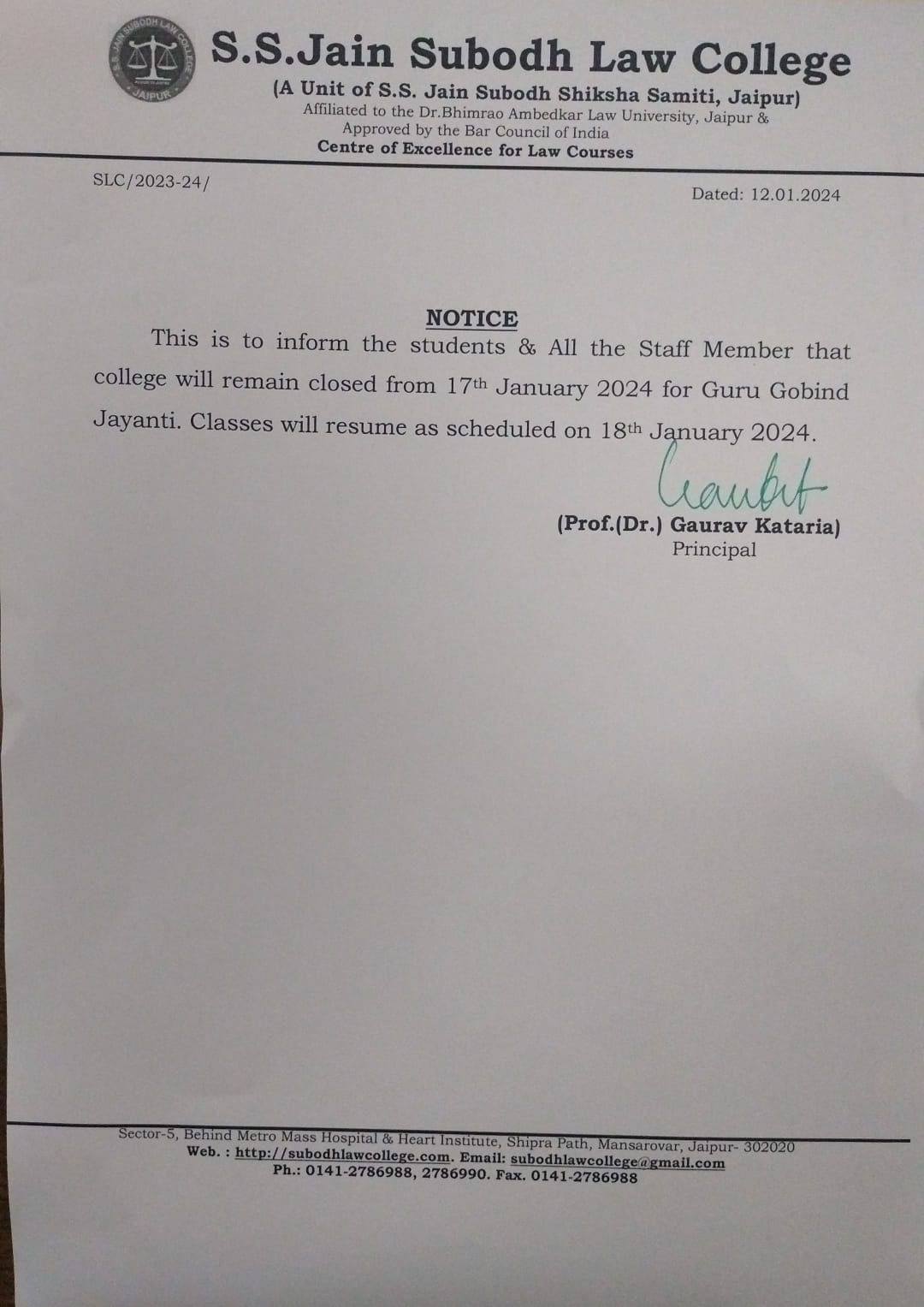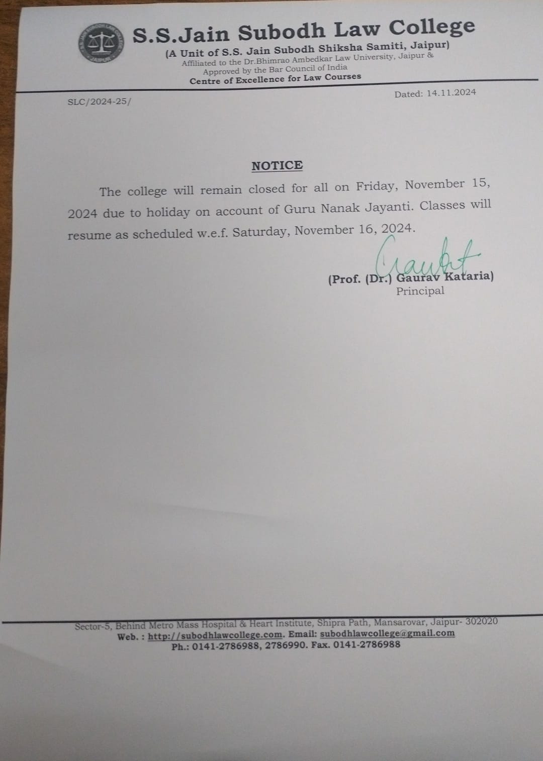 College will be remain closed on 15th November Friday on account of Guru Nanak Jayanti Holiday . College will re-open from Saturday 16 November 2024. College will be remain closed on 15th November Friday on account