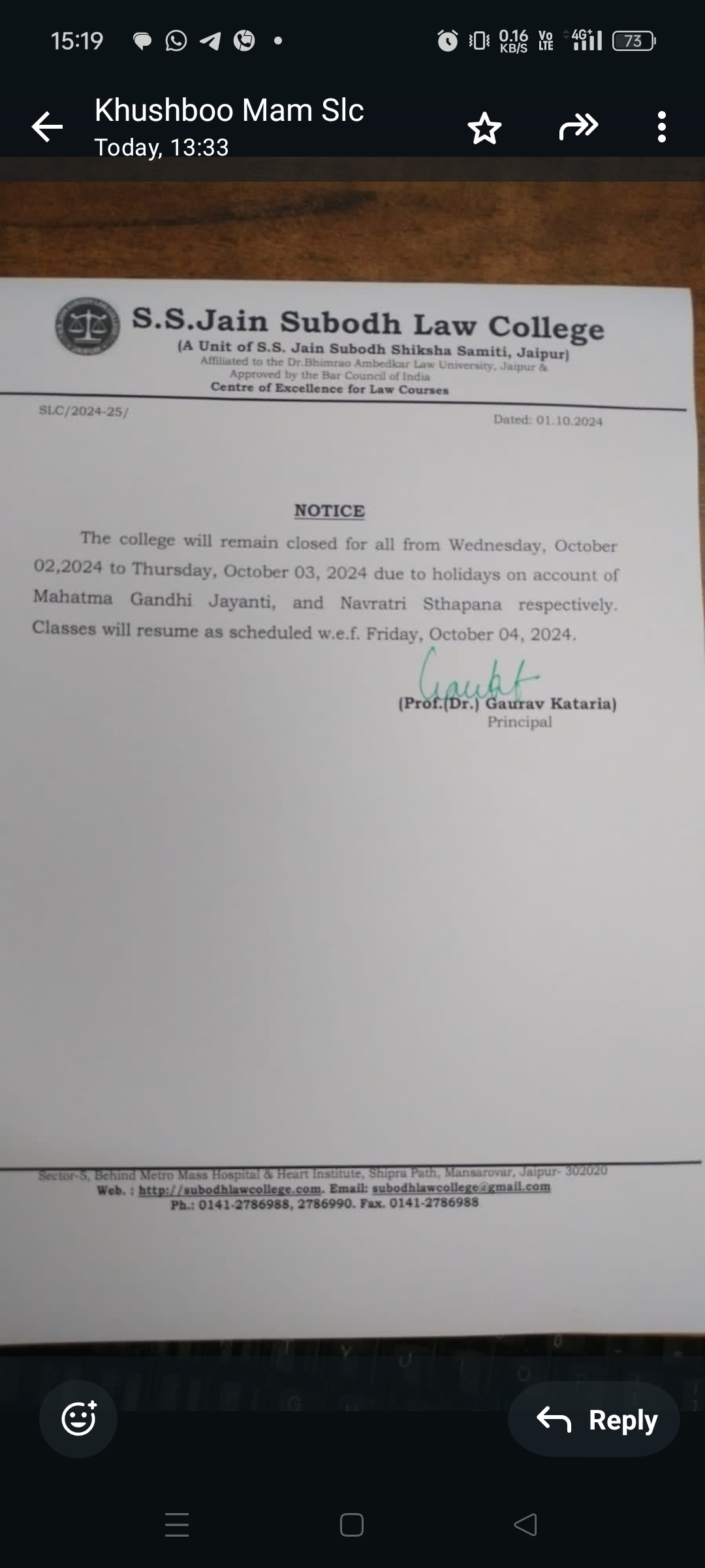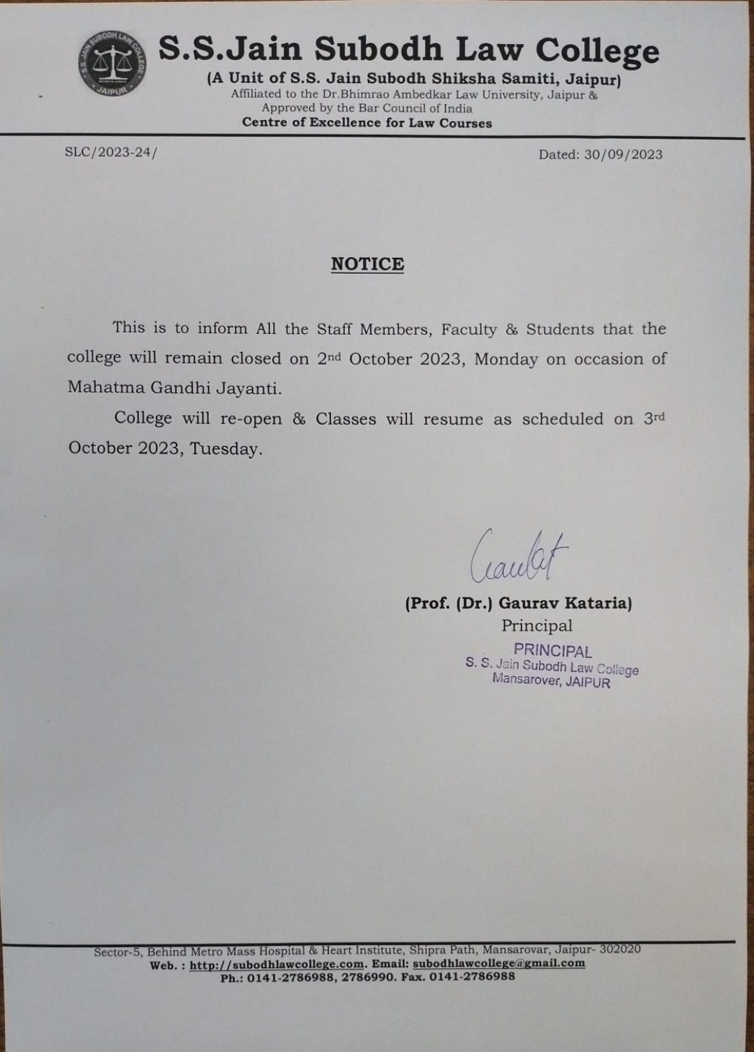 College will remain closed on 02 October 2024 and 03 October 2024 holiday on account of Gandhi Jayanti and Navratri Stahpana College will remain closed on Wednesday 02 October 2024 and Thursday 03 October 2024 holiday on account of Gandhi Jayanti and Navratri Stahpana College will resume w.e.f from Friday 04 October 2024 |
