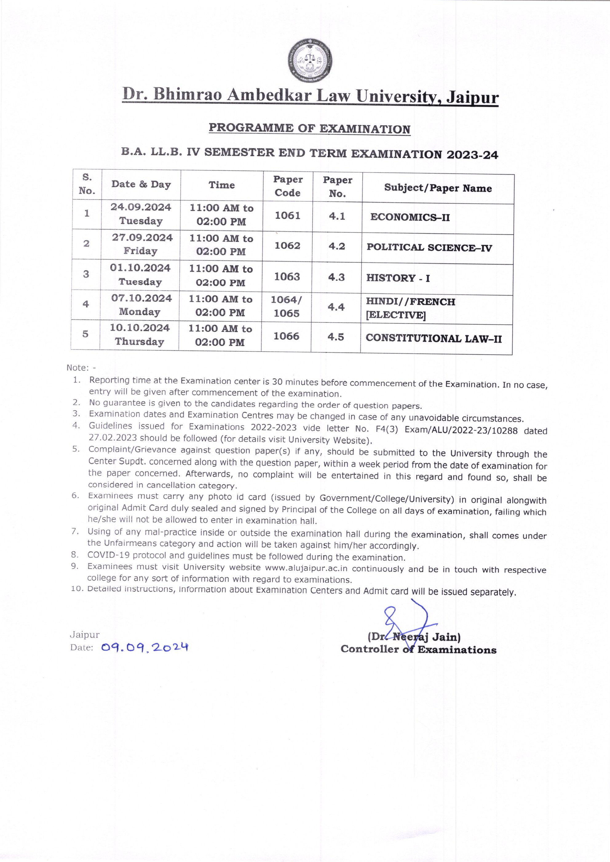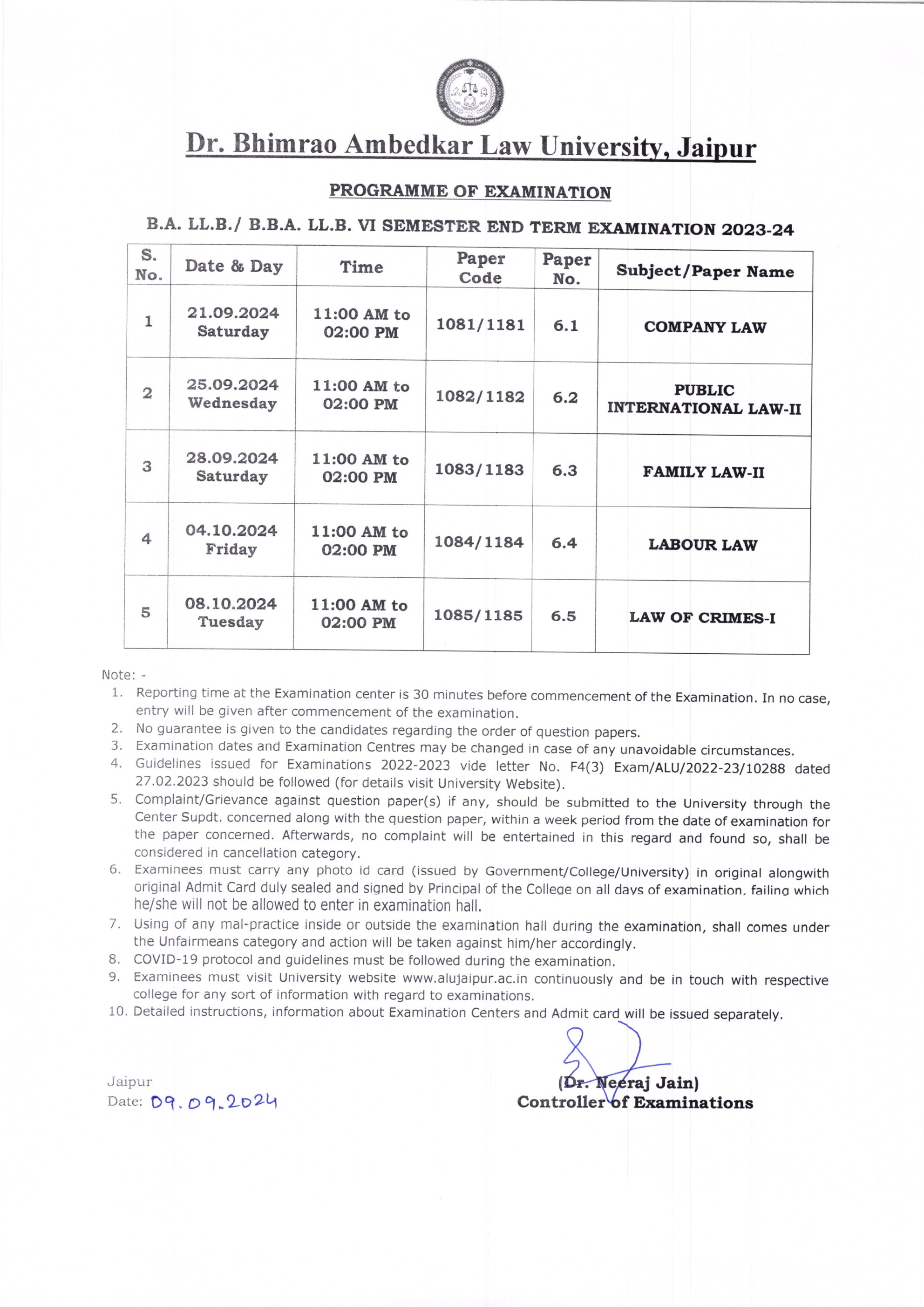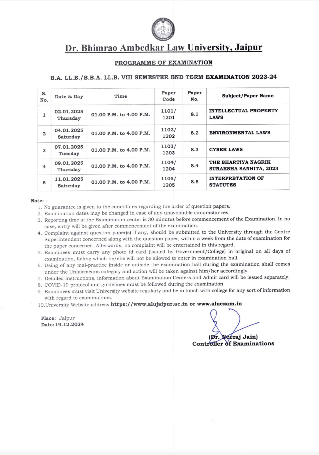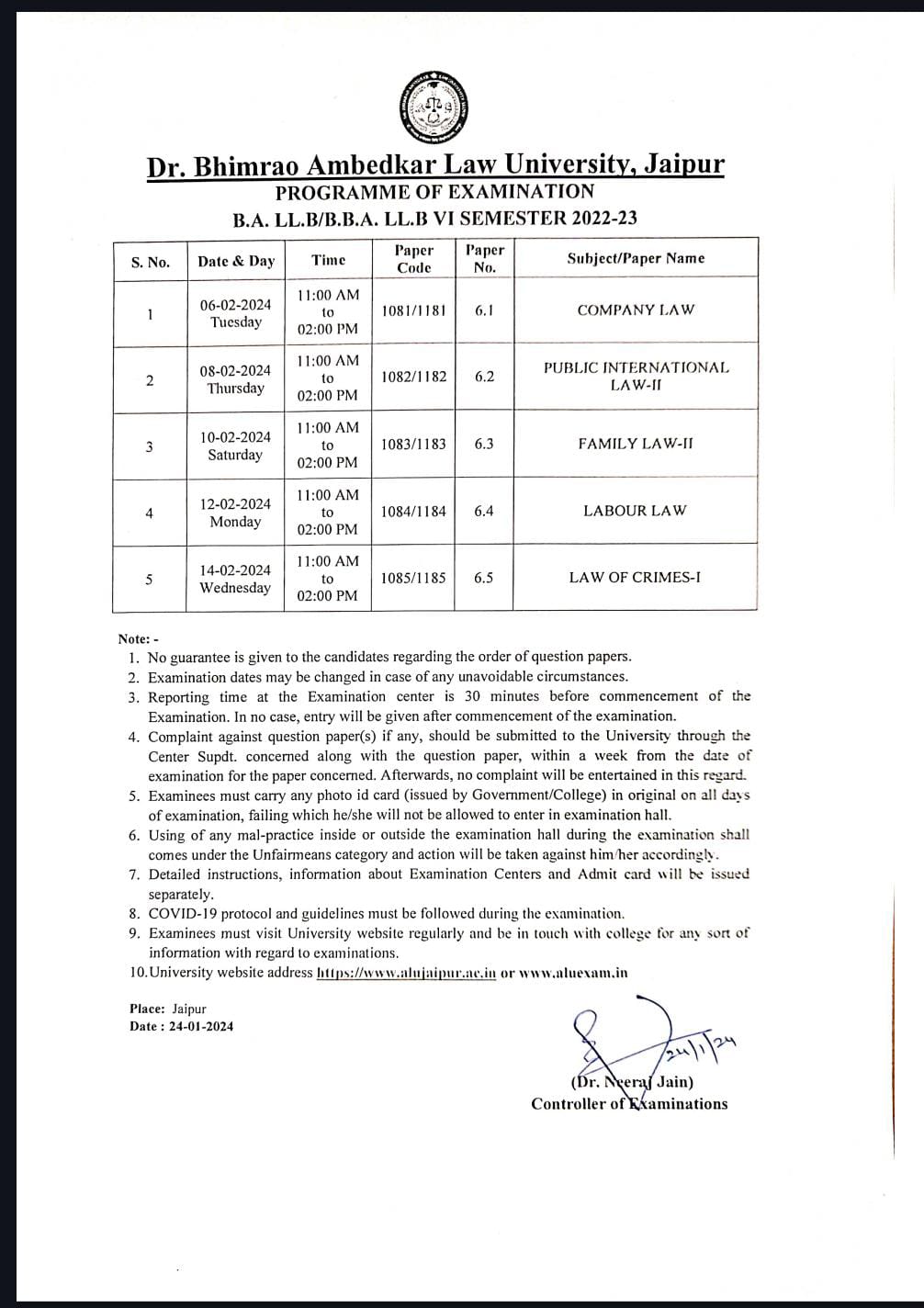 B.A. LL.B VII SEMESTER TIME TABLE 2024 ALU , JAIPUR B.A. LL.B VII SEMESTER TIME TABLE 2024 ALU , JAIPUR