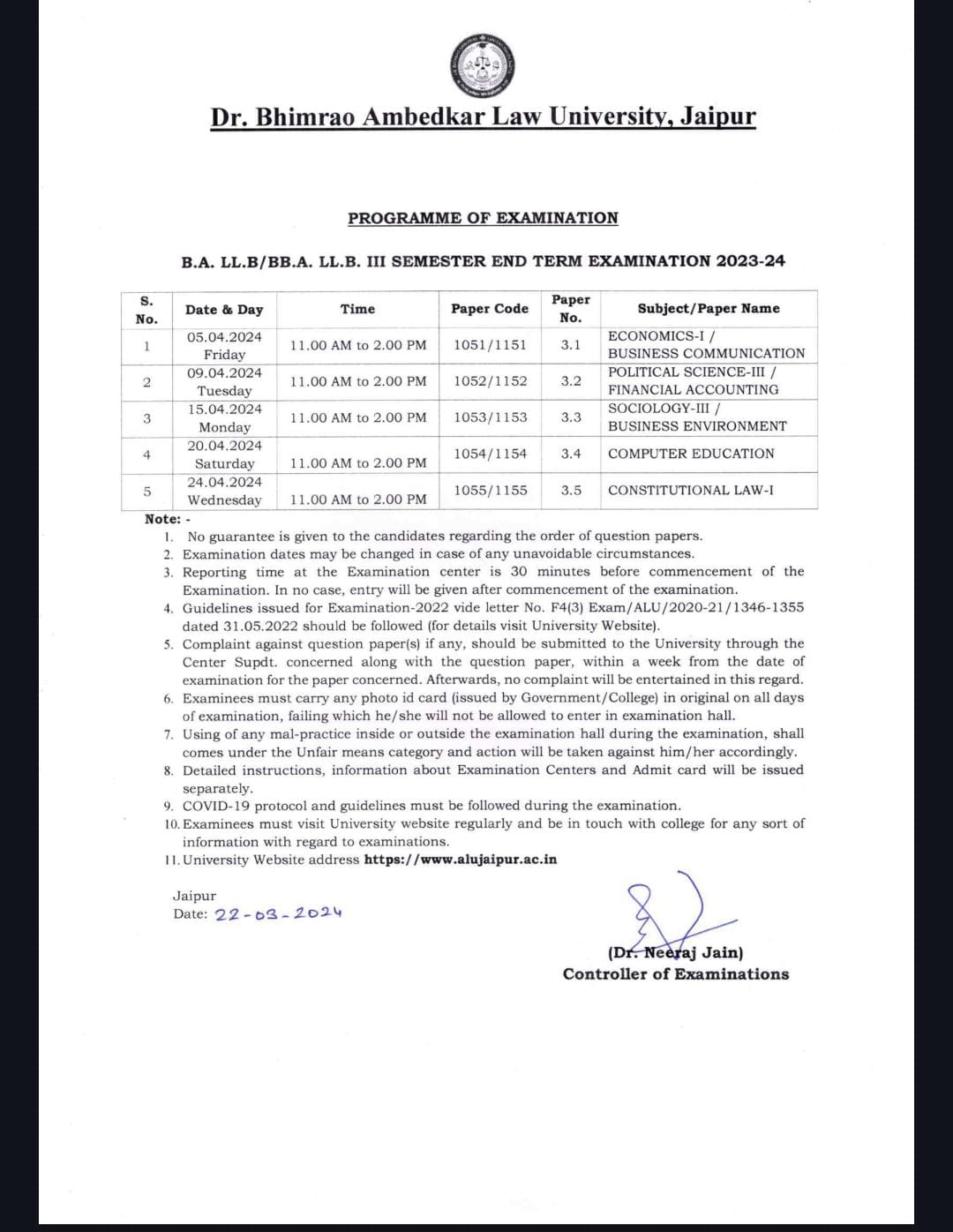 LL.B Third Year Examination 2023-24 Time Table LL.B Third Year Examination 2023-24 Time Table
