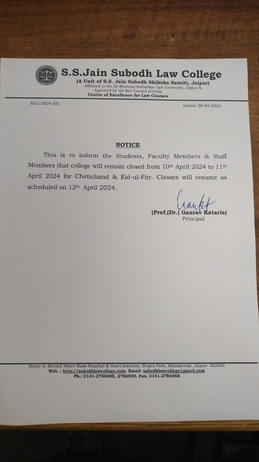 of Ram Navami Holiday. College will re-open and classes will resume as