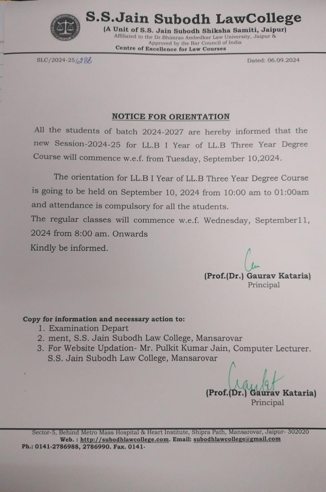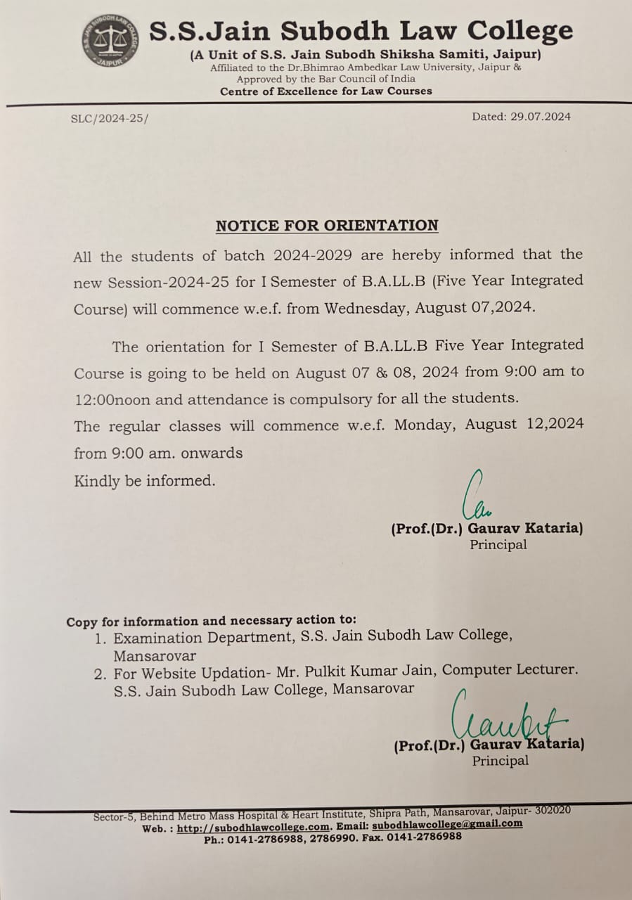 Orientation for LL.B Ist year is going to held on September 10, 2024 from10:00 AM to 01:00 PM and attendance is compulsory for all the students. Orientation for LL.B Ist year is going to held on September 10, 2024 from10:00 AM to 01:00 PM and attendance is compulsory for all the students.