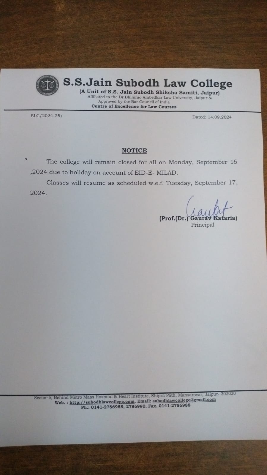 account of EId-E- Milad. Classes will resume as scheduled w.e.f Tuesday, September 17, 2024. |