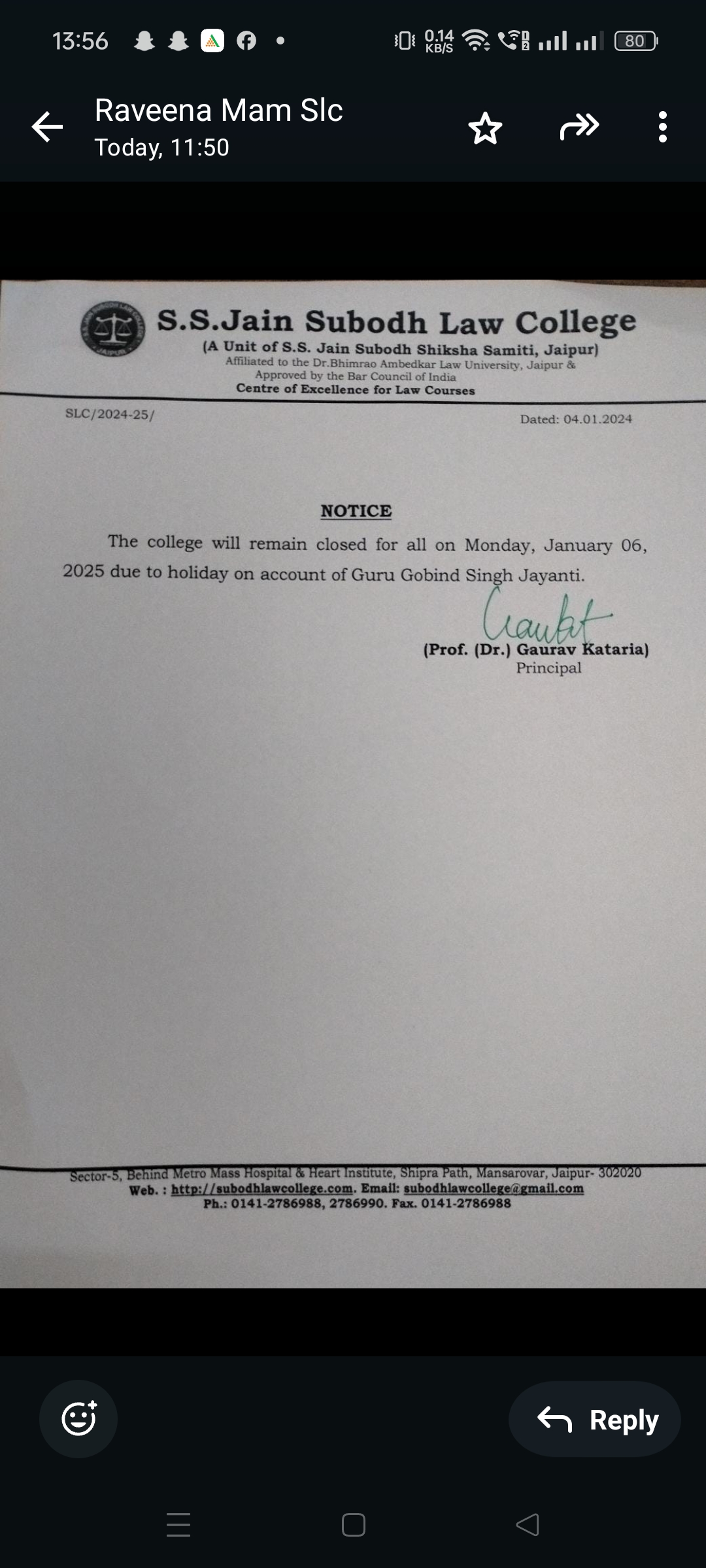 of Guru Nanak Jayanti Holiday . College will re-open from Saturday 16 November