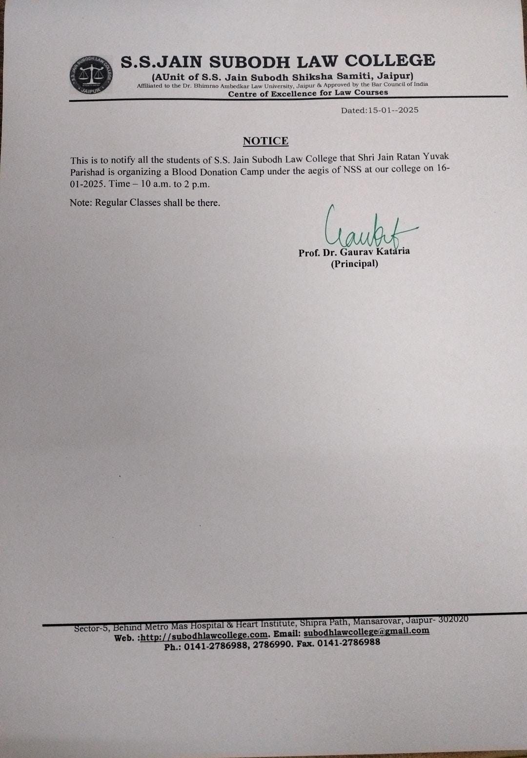 Shri Jain Ratan Yuvak Parishad is Organizing a Blood Donation Camp under the aegis of NSS at S.S. Jain Subodh Law College on 16 January 2025 10:00 A.M .to 2:00 P.M. Shri Jain Ratan Yuvak Parishad is Organizing a Blood Donation Camp under the aegis of NSS at S.S. Jain Subodh Law College on 16 January 2025 10:00 A.M .to 2:00 P.M.