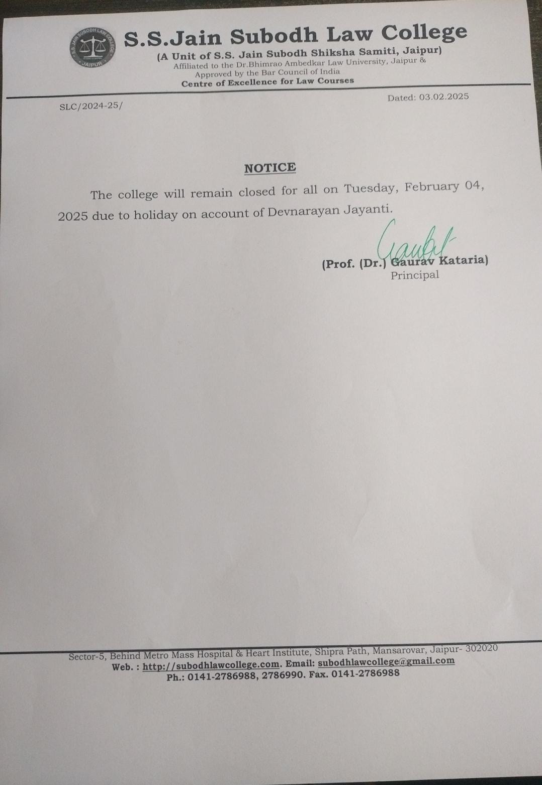 College Will Remain Closed on Tuesday 4th February on account of Devnarayan Jaynti Holiday College Will Remain Closed on Tuesday 4th February on account of Devnarayan Jayanti Holiday. |
