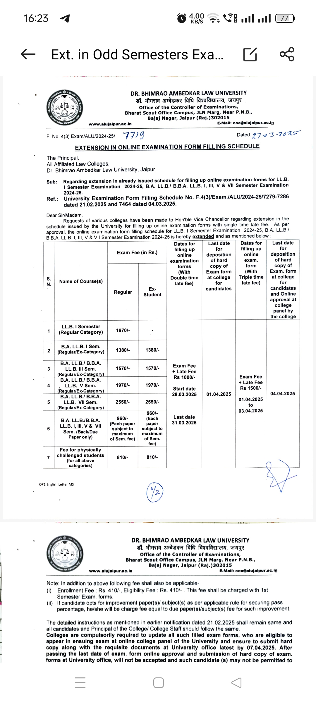 Extension in Exam From Filling For B.A. LLB. Examination 2023 Notice ALU, Jaipur Extension in Exam From Filling For B.A. LLB. Examination 2023 Notice ALU, Jaipur