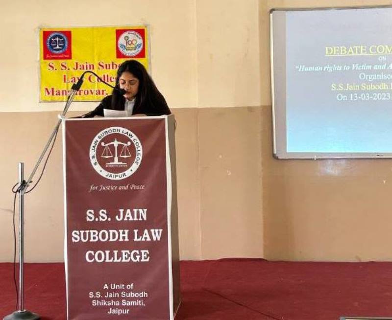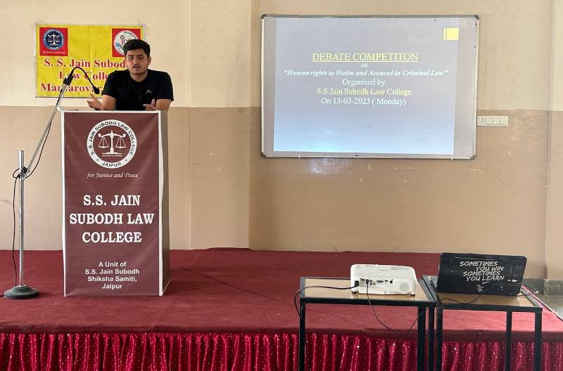 On the 13th of March, 2023, a successful debate competition was held in the premises of S.S. Jain Subodh Law College, Jaipur. The topic of the competition was "Human Rights to Victim and Accused in Criminal Law." The event was organized by the cultural committee of the college along with the students under the guidance of the Vice-Principal.